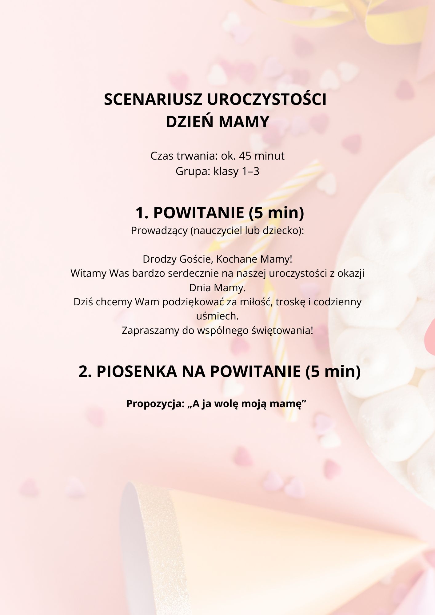 Scenariusz uroczystości z okazji Dnia Mamy przeznaczony jest dla uczniów klas 1–3 szkoły podstawowej. Celem wydarzenia jest kształtowanie postaw szacunku, miłości i wdzięczności wobec matek oraz rozwijanie umiejętności artystycznych dzieci poprzez recytację, śpiew i elementy inscenizacji.Uroczystość ma charakter podniosły, ale jednocześnie radosny i dostosowany do wieku dzieci. Program obejmuje powitanie gości, występy artystyczne w postaci piosenek, recytację wierszyków indywidualnych oraz zbiorowych, a także krótką scenkę tematyczną ukazującą rolę mamy w życiu dziecka.Dzieci aktywnie uczestniczą w wydarzeniu – każde ma przydzieloną rolę, dzięki czemu wzmacniane jest poczucie własnej wartości i odpowiedzialności za wspólne wystąpienie. W trakcie uroczystości uczniowie prezentują przygotowane wcześniej utwory muzyczne i teksty, wyrażając w ten sposób swoje uczucia wobec mam.Zwieńczeniem wydarzenia jest wspólne złożenie życzeń oraz wręczenie przygotowanych przez dzieci upominków i laurek. Całość trwa około 45 minut i może być realizowana w sali lekcyjnej lub na sali gimnastycznej.Scenariusz sprzyja integracji środowiska szkolnego oraz budowaniu pozytywnych relacji między dziećmi a ich rodzinami, a także stanowi ważny element wychowania emocjonalnego i społecznego uczniów.