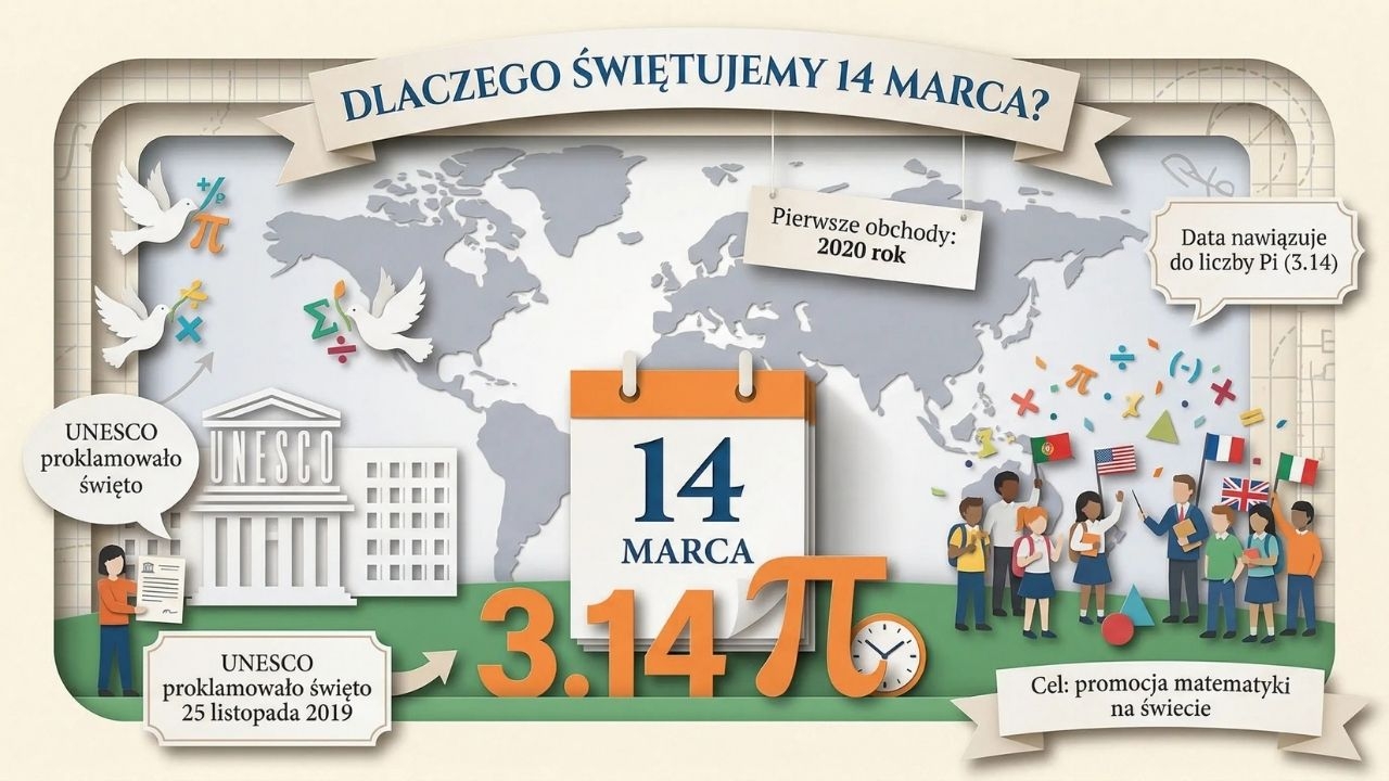 To efektowna, „plakatowa” gazetka szkolna w PDF przygotowana na Dzień Matematyki obchodzony 14 marca. Zestaw zawiera 1 plik PDF i 10 stron/10 plansz. Materiał otwiera okładka „Dzień Matematyki – Królowa Nauk” (str. 1), następnie wyjaśnia, dlaczego świętujemy 14 marca i nawiązuje do liczby π oraz decyzji UNESCO (str. 2). Kolejne plansze prezentują „tajemnice liczby π” (m.in. niewymierność, symbol i ciekawostki) (str. 3), pokazują matematykę w codzienności – w kuchni i na zakupach (przeliczanie przepisów, rabaty, budżet) (str. 4) oraz w podróży i świecie gier (planowanie czasu i kosztów, grafika 3D, symulacje, algorytmy) (str. 5). W materiale znajduje się także mocny polski wątek: Marian Rejewski i złamanie kodu Enigmy (str. 6), Stefan Banach i szkoła lwowska (str. 7) oraz Stanisław Ulam i metoda Monte Carlo (str. 8). Całość uzupełnia „Kącik matematycznych łamigłówek” (str. 9) i finałowa plansza motywacyjna „Matematyka – klucz do świata” (str. 10).