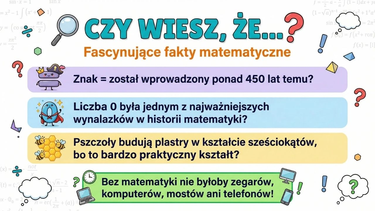 Zestaw 10 kolorowych plansz w formacie PDF przygotowanych na obchody Dnia Matematyki (12 marca). Materiał zawiera plakaty do wywieszenia w klasie, na korytarzu lub w świetlicy: planszę tytułową „Królowa Nauk zaprasza!”, treści pokazujące, że matematyka jest obecna w codziennym życiu, hasła i sentencje motywujące uczniów, krótkie ciekawostki matematyczne, przykłady zastosowań matematyki w praktyce (np. w sklepie, kuchni, sporcie czy podróży), a także „kącik zagadek” wraz z odpowiedziami. To gotowa dekoracja i jednocześnie pretekst do rozmowy o tym, po co uczymy się matematyki i jak może ona pomagać na co dzień.