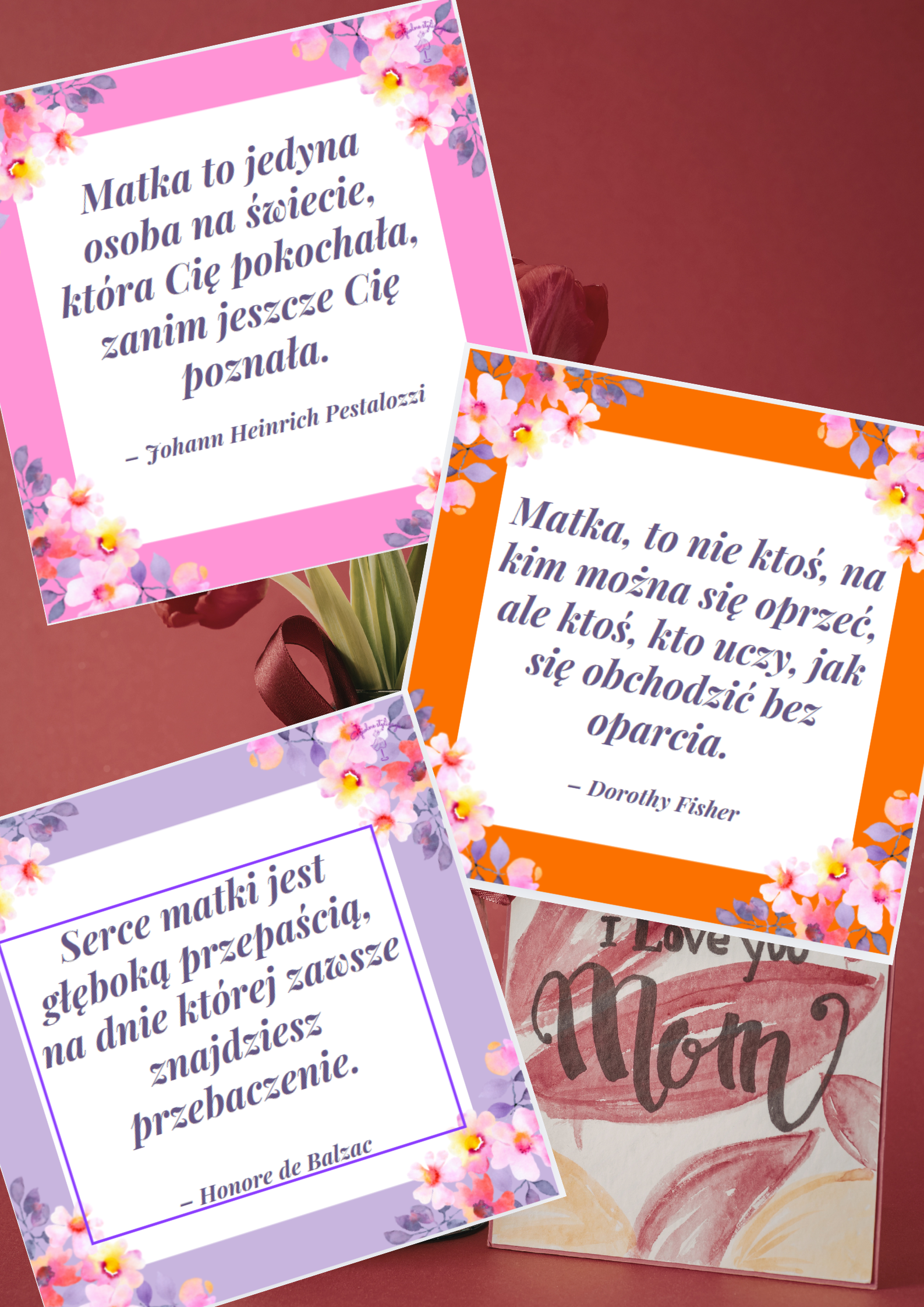 Zestaw składa się z 10 kart, na których widnieją złote myśli poświęcone mamie i macierzyństwu. Całość wzbogacona kwiatową grafiką.
