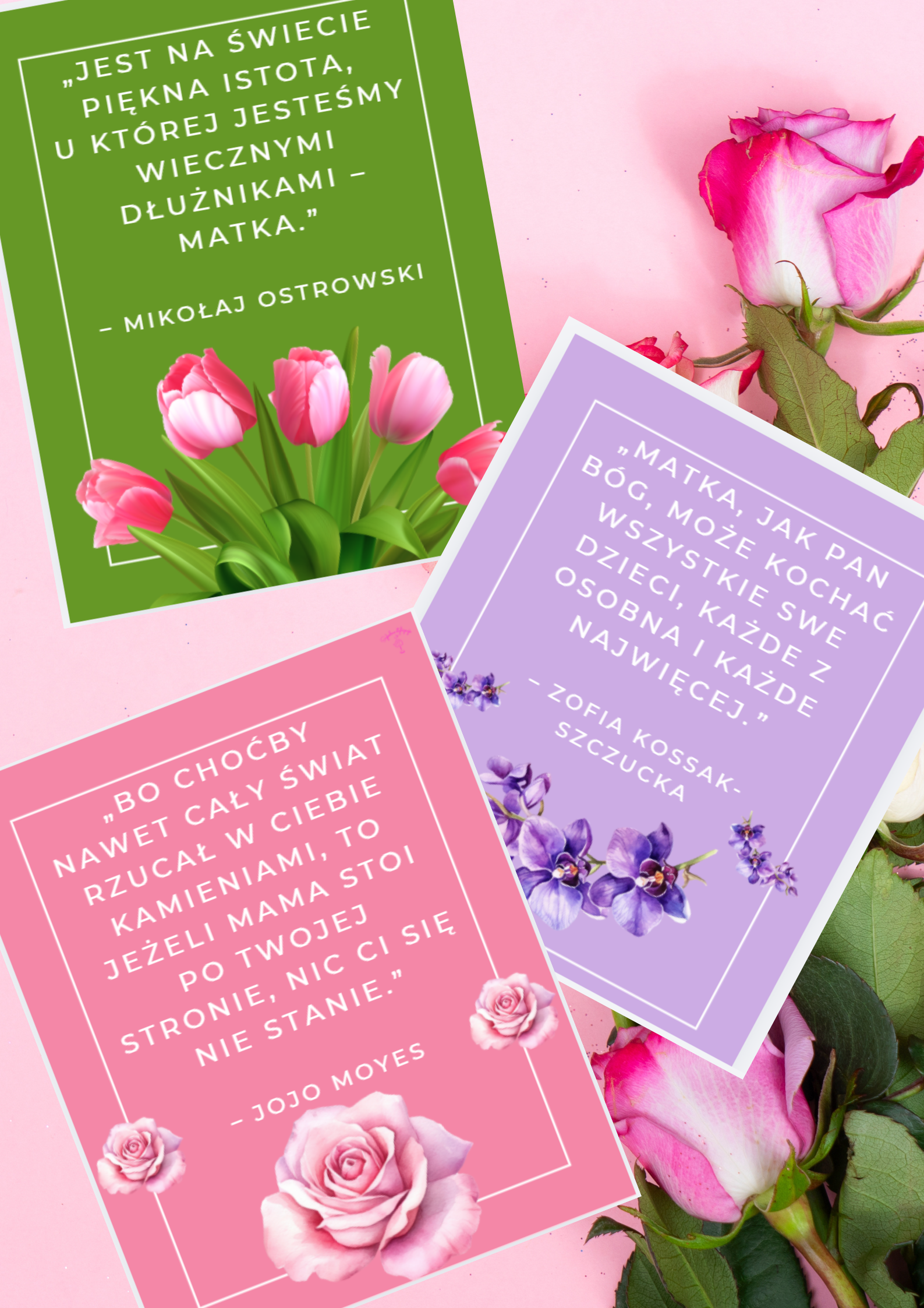 Zestaw składa się z 10 kart, na których widnieją złote myśli poświęcone mamie i macierzyństwu. Całość wzbogacona kwiatową grafiką.