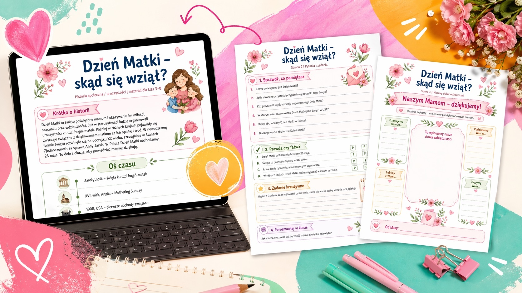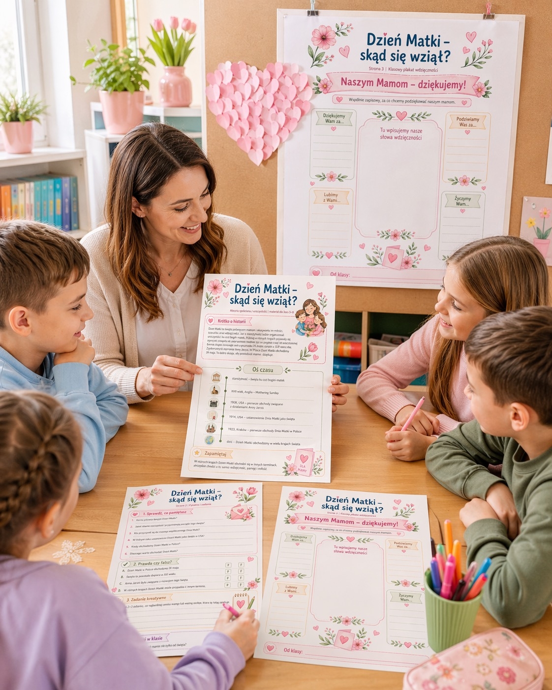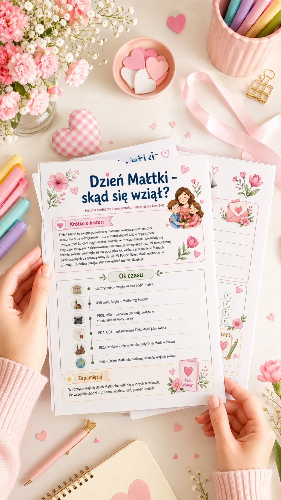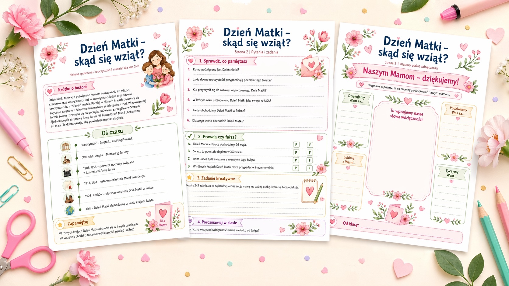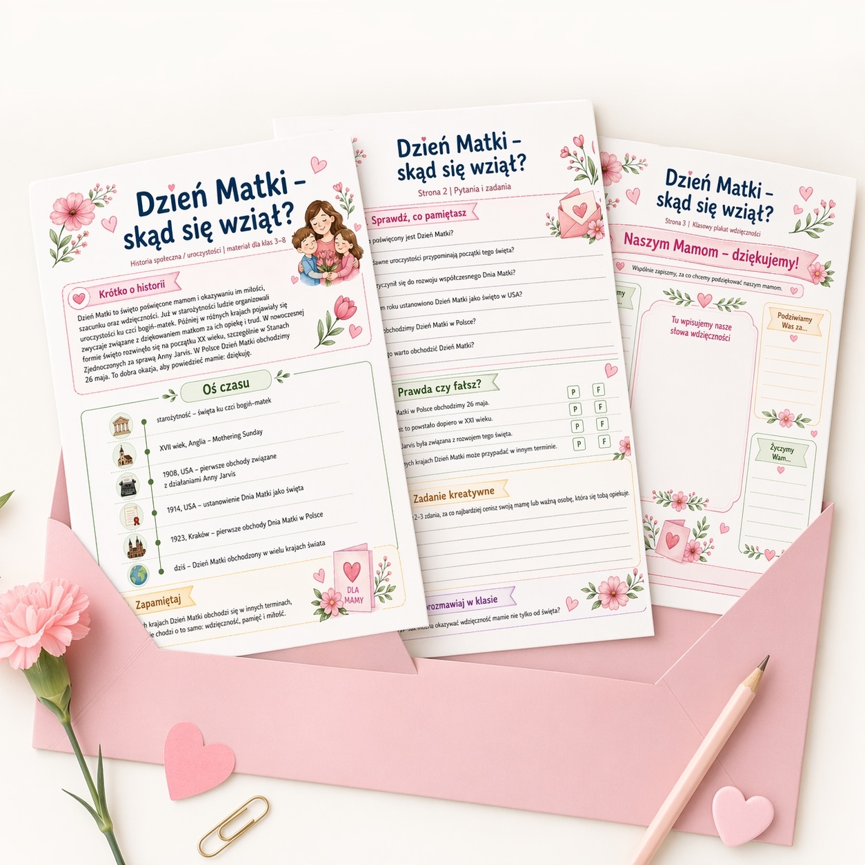 To 3-stronicowy materiał edukacyjny o historii Dnia Matki, przygotowany dla uczniów klas 3–8. Zawiera krótki i przystępny tekst wyjaśniający, skąd wzięło się to święto, uporządkowaną oś czasu pokazującą najważniejsze etapy jego rozwoju, a także pytania i zadania utrwalające wiedzę. Na końcu znajduje się miejsce na klasowy plakat wdzięczności, dzięki któremu uczniowie mogą wspólnie stworzyć piękną, osobistą pracę dla mam. Całość ma ciepły, estetyczny i szkolny charakter, dlatego świetnie sprawdzi się podczas lekcji, zajęć okolicznościowych lub klasowych uroczystości. 📚🌸✨
