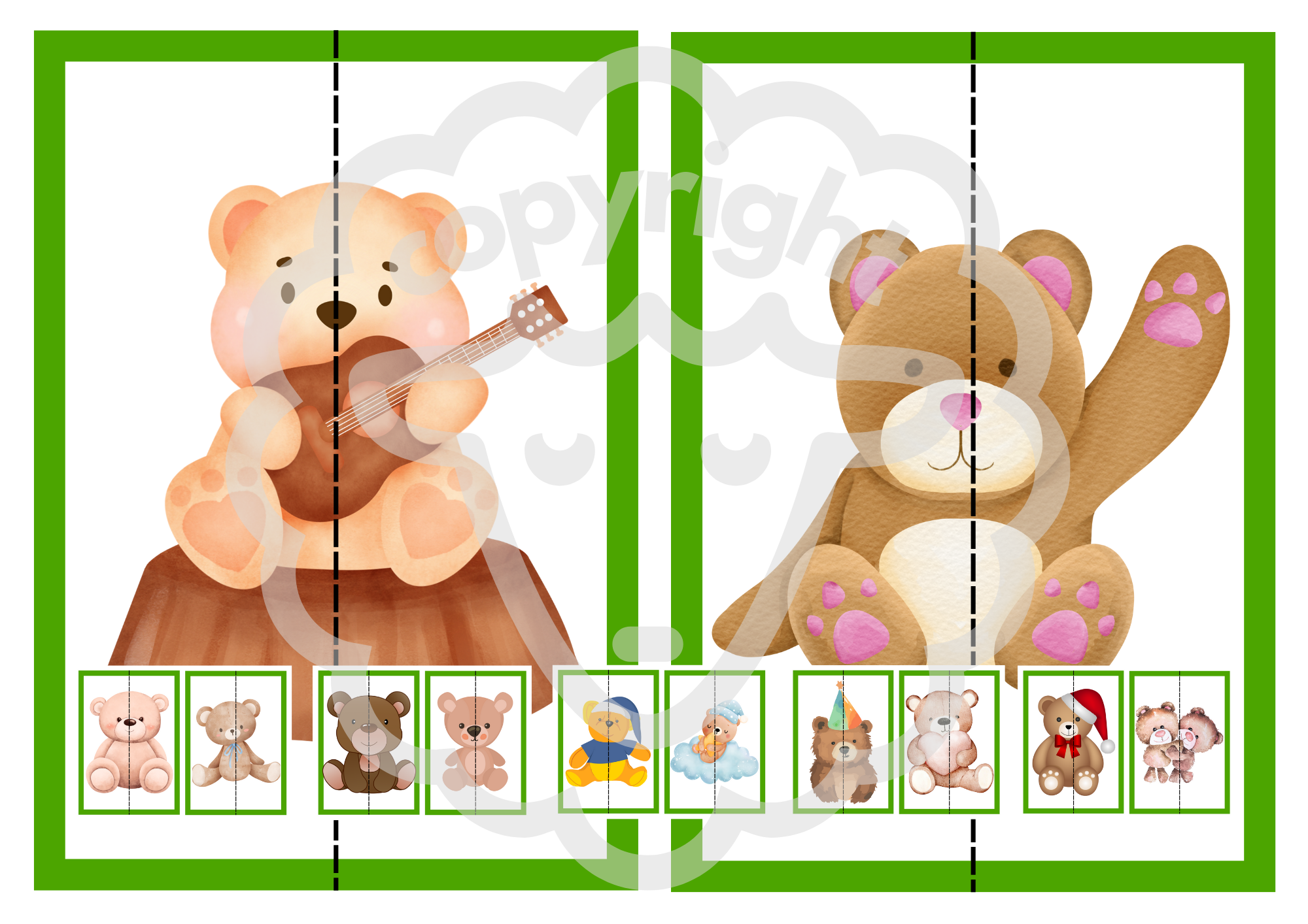Karty do gry dla małych dzieci. Po wydrukowaniu i wycięciu, przecinamy w miejscu przerywanej kreski. Karty można laminować. Dzieci bawią się poprzez szukanie i dopasowanie drugiej połowy misia. Projekt zawiera 6 kart - A4 po 2 misie, w formacie pdf.