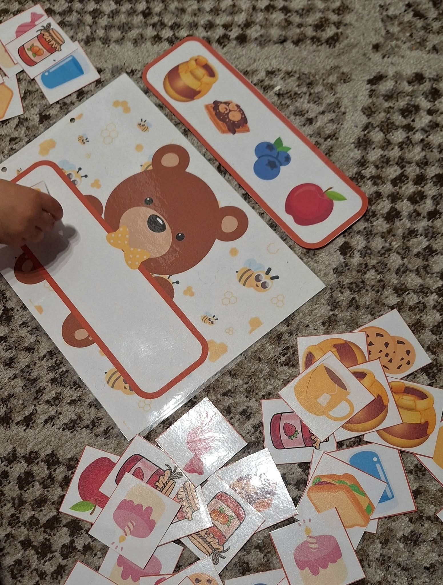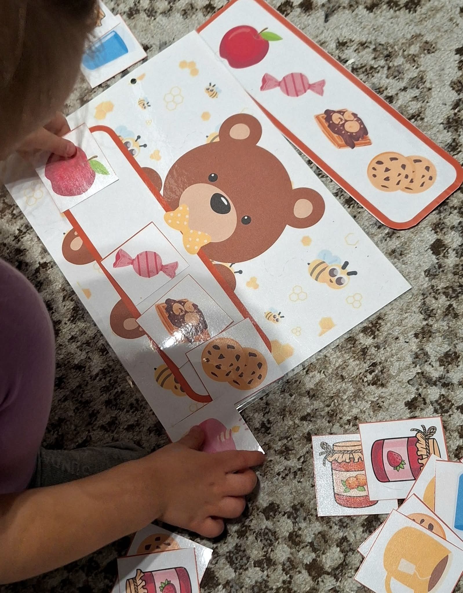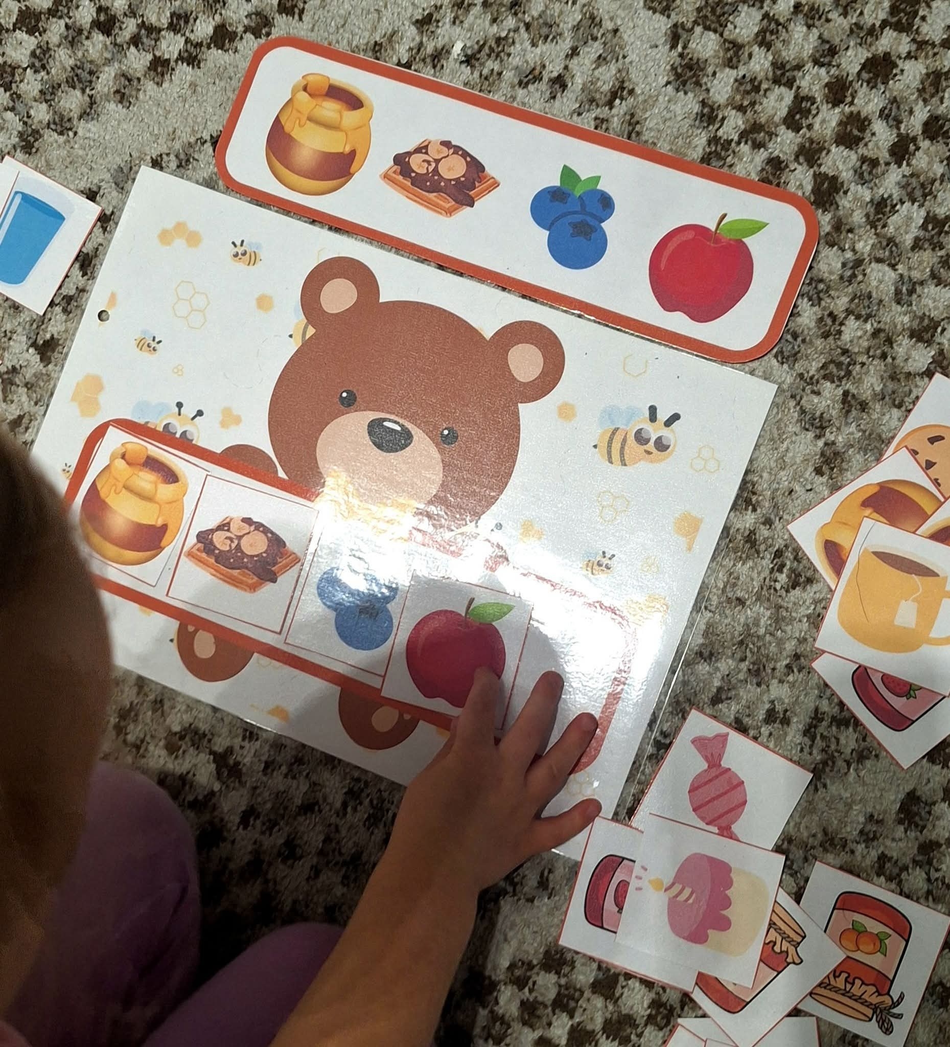 Zadaniem dzieci jest ułożenie w odpowiedniej kolejności przysmaków, na które miś ma ochotę! Materiały wystarczy wydrukować, można je również zalaminować oraz użyć rzepu samoprzylepnego (nie jest to jednak konieczne).