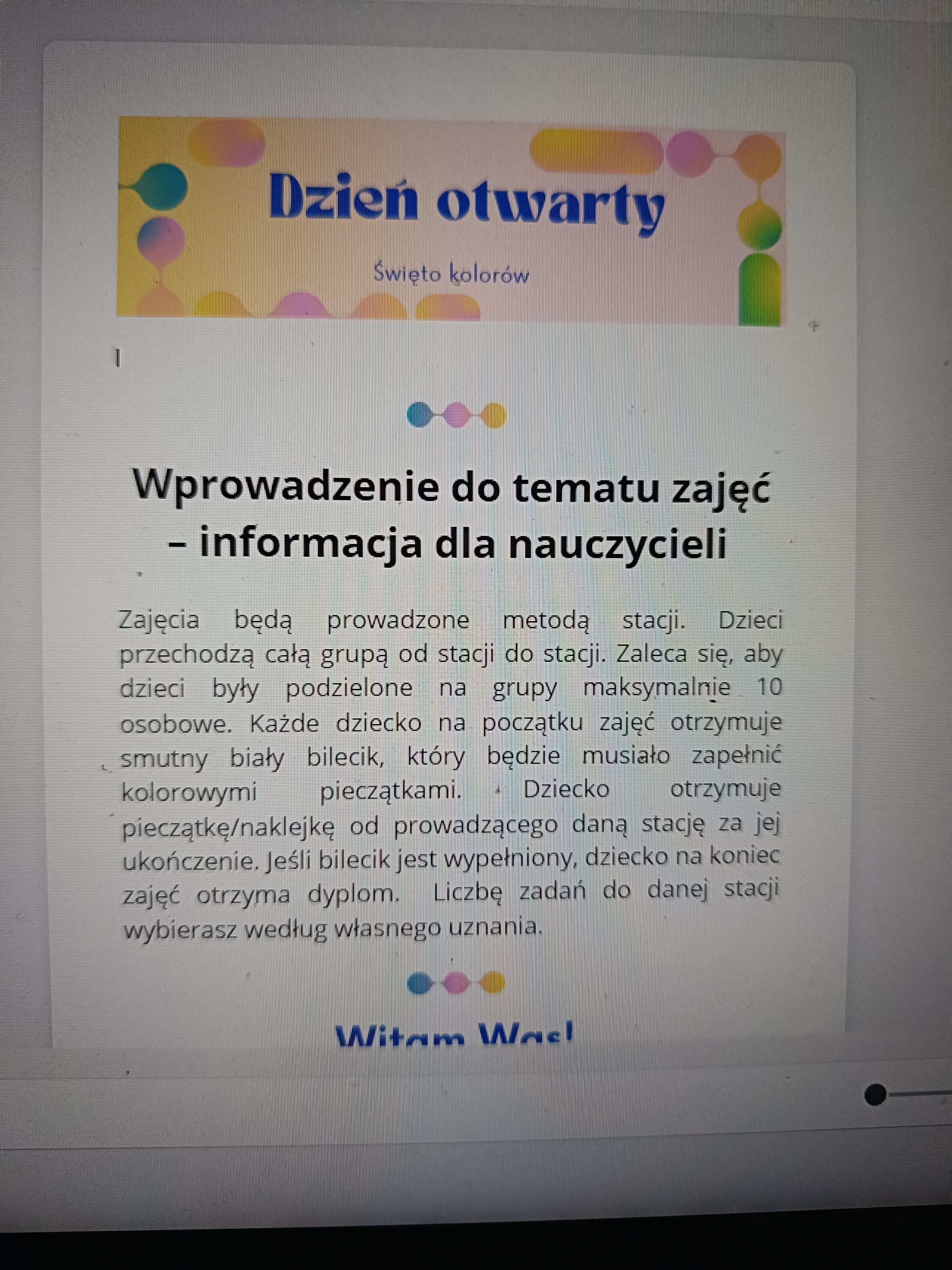 Materiał zawiera scenariusz zajęć z "Święto kolorów" który jest realizowany metodą stacji. W scenariuszu są uwzględnione wszystkie materiały potrzebne dla nauczyciela. Zajęcia obejmują: eksperymenty, zabawy ruchowe, prace plastyczną, bajkę, kodowanie.