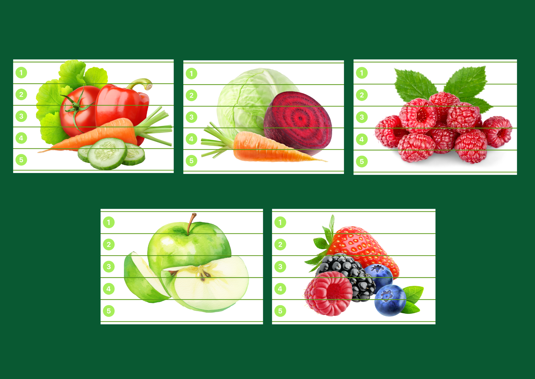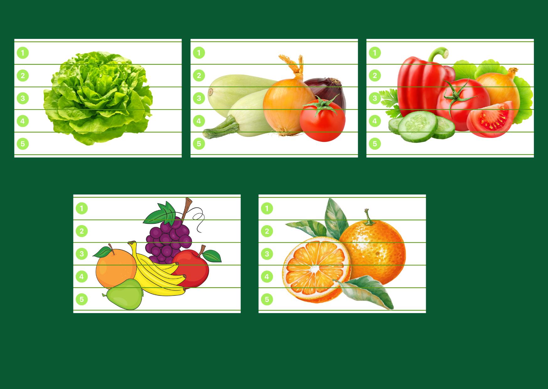 Zestaw 10 puzzli dla młodszych dzieci z ilustracjami warzyw i owoców. Po wydrukowaniu warto materiał zalaminować.