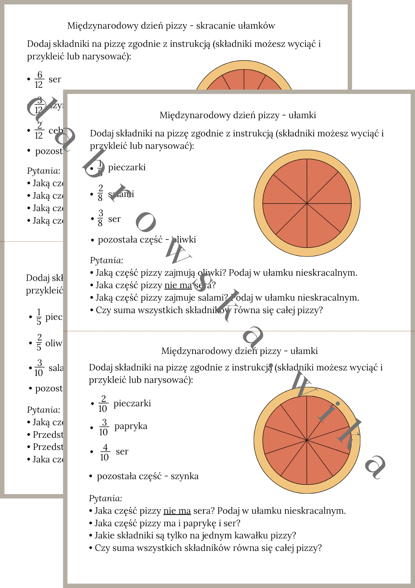 • Dodawać składniki na pizzę zgodnie z podanymi ułamkami.