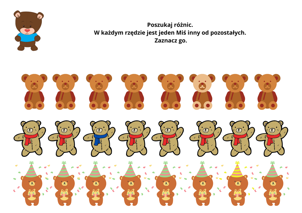 Zestaw składający się z 48 stron i zadań dla dzieci w wieku przedszkolnym i wczesnoszkolnym, a w nim: dopasuj cienie opowiedz historię kategoryzacje – uporządkuj od najmniejszego do największego, dopasuj kolory ćwiczenia na spostrzegawczość – co schował Miś lub gdzie schował się Miś; znajdź pary; wskaż który element nie pasuje liczenie – przeliczenie Misiów, kolorowanie wskazanej liczby labirynty klamerkowe zabawy z Misiem połączone z nauką kolorów rozróżnianie stron LEWA i PRAWA emocje – nazywanie i malowanie własnej emocji kolorowanie według wskazówek wyklejanie plasteliną