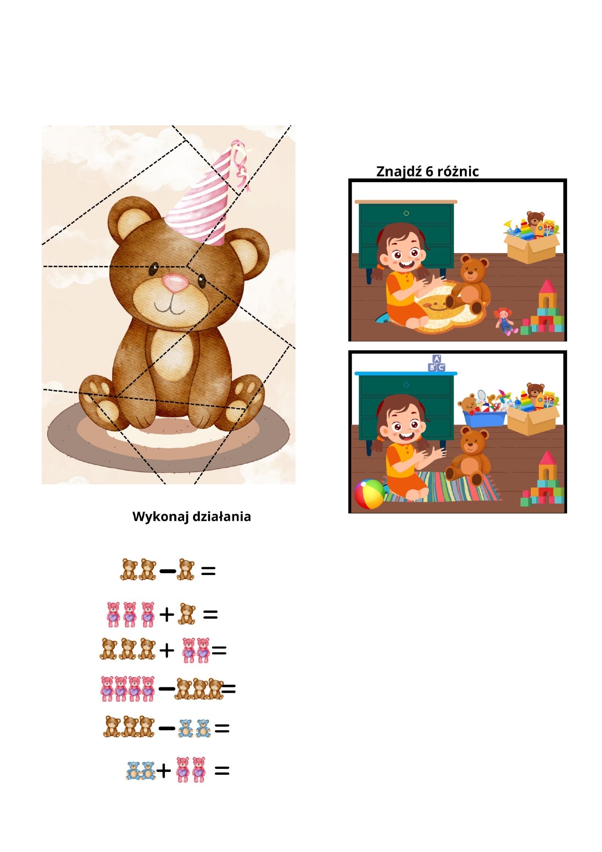 - zadania: "Dopasuj cienie", "Wykonaj działania", "Znajdź różnicę", "Policz"