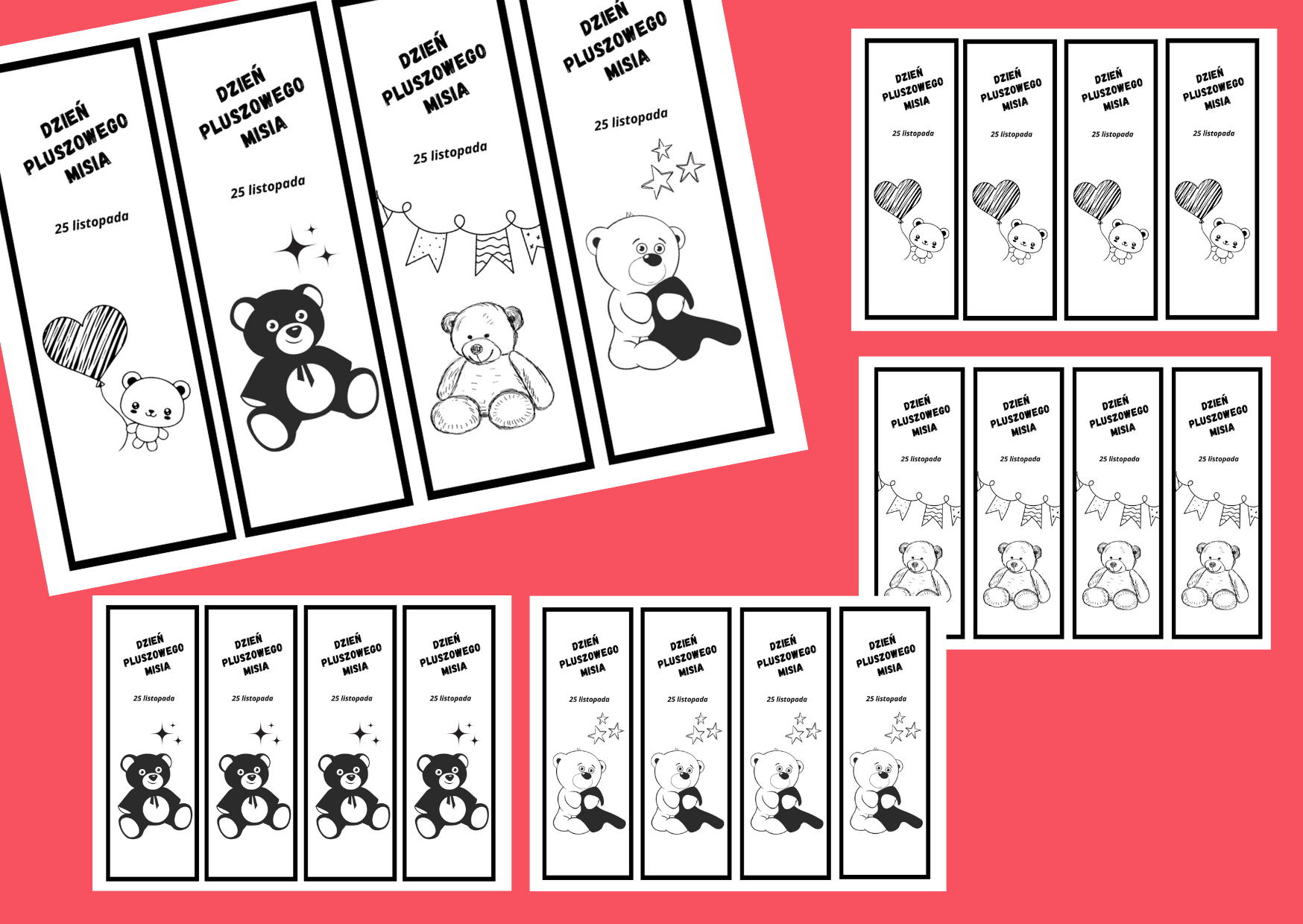 Zestaw 4 rodzajów zakładek do książek. Składa się z 5 stron: na pierwszej stronie zamieszczony jest zestaw 4 zakładek, pozostałe strony przeznaczone są dla poszczególnych wersji.