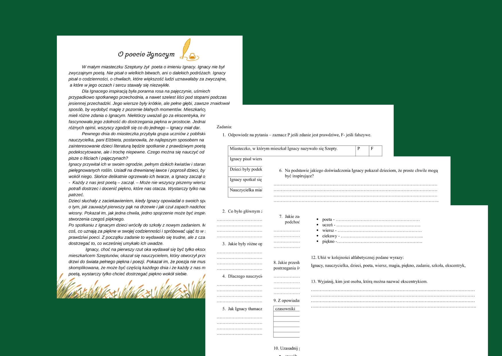 Materiał zawiera test czytania ze zrozumieniem, dotyczący oryginalnego opowiadania pt. "O poecie Ignacym" wraz z odpowiedziami. Test sprawdza umiejętność czytania ze zrozumieniem, zawiera również pytania dotyczące gramatyki i ortografii. składa się z 13 zadań (zamkniętych i otwartych). Przeznaczony jest dla uczniów z klas 4-6 i można go wykorzystać nie tylko z okazji Dnia Poezji.