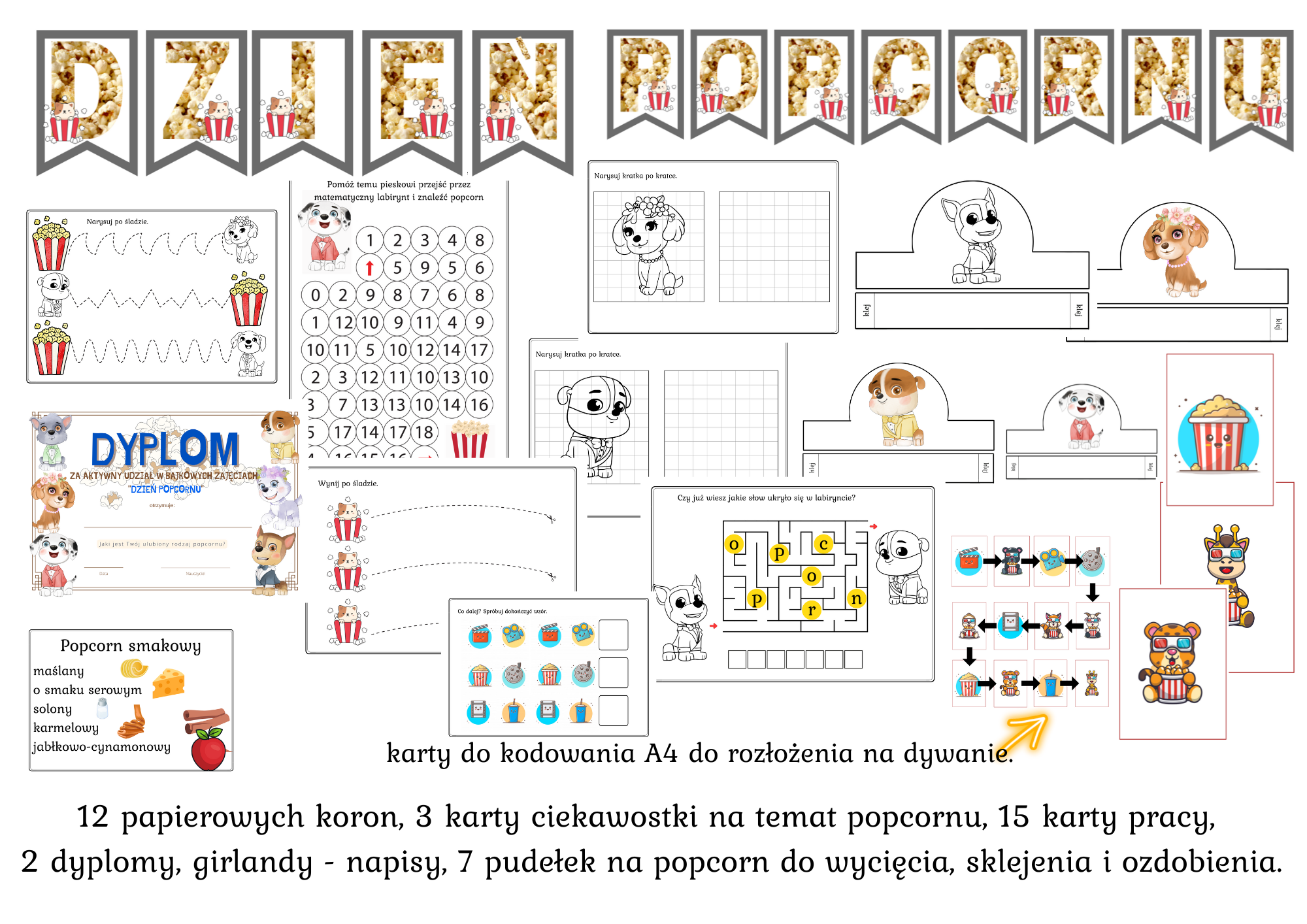 -7 pudełek na popcorn do wycięcia, sklejenia i ozdobienia.