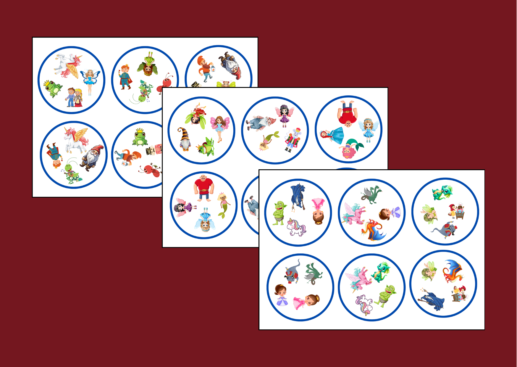 Zestaw zawiera 6 kart w wersji kolorowej. Na każdej karcie znajduje się 6 kół z obrazkami zwierząt. Po wycięciu materiał można zalaminować, aby dłużej służył. Można je wykorzystać na lekcji do ćwiczeń redakcyjnych, gramatycznych czy ortograficznych.