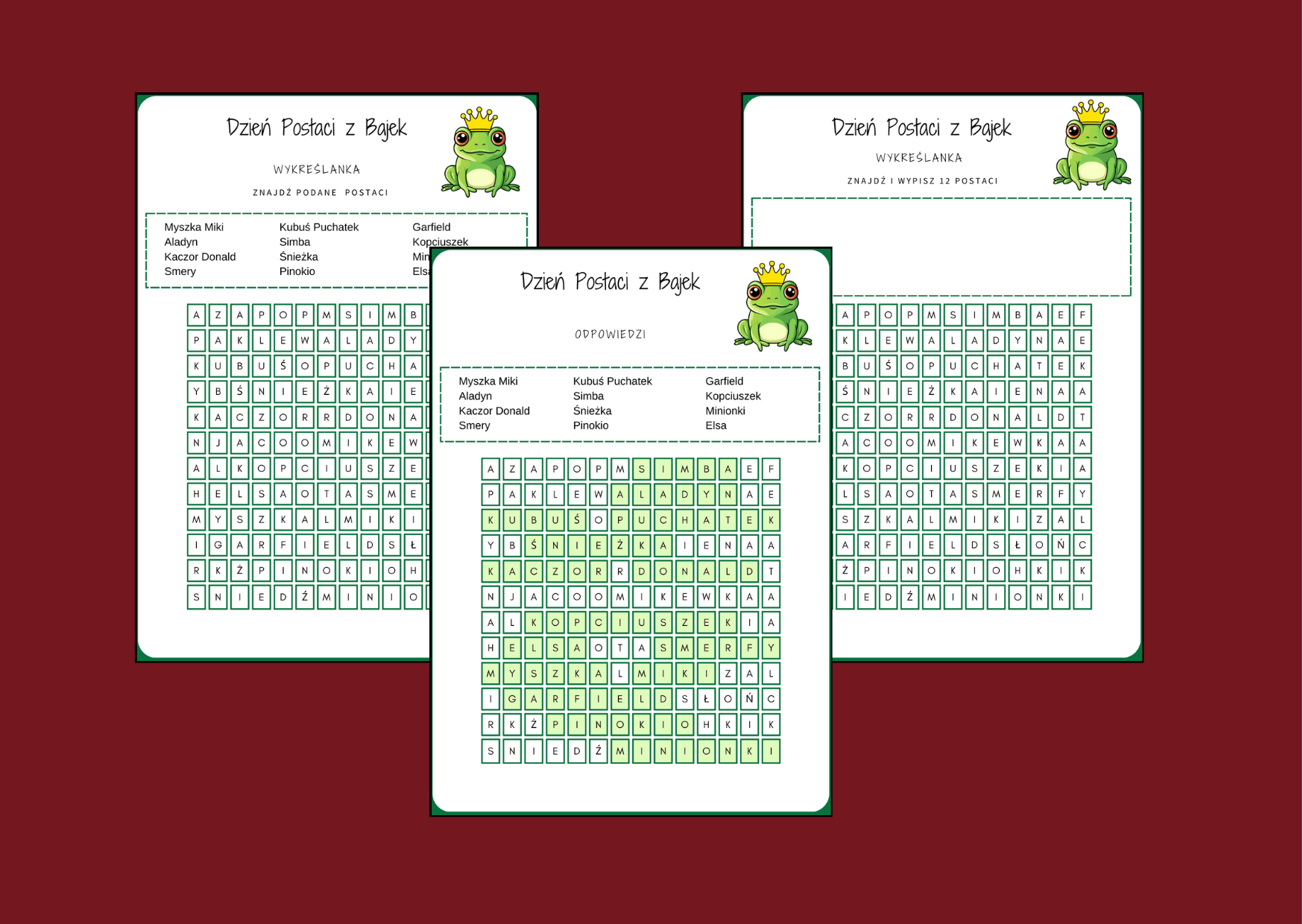 Materiał zawiera wykreślankę dotyczącą postaci z bajek. Proponuję 3 wersje wykreślanek: z odpowiedziami, bez odpowiedzi, bez wyrazów do odnalezienia. Po odnalezieniu nazw można je wykorzystać do ćwiczeń w redagowaniu zdań lub historyjek.