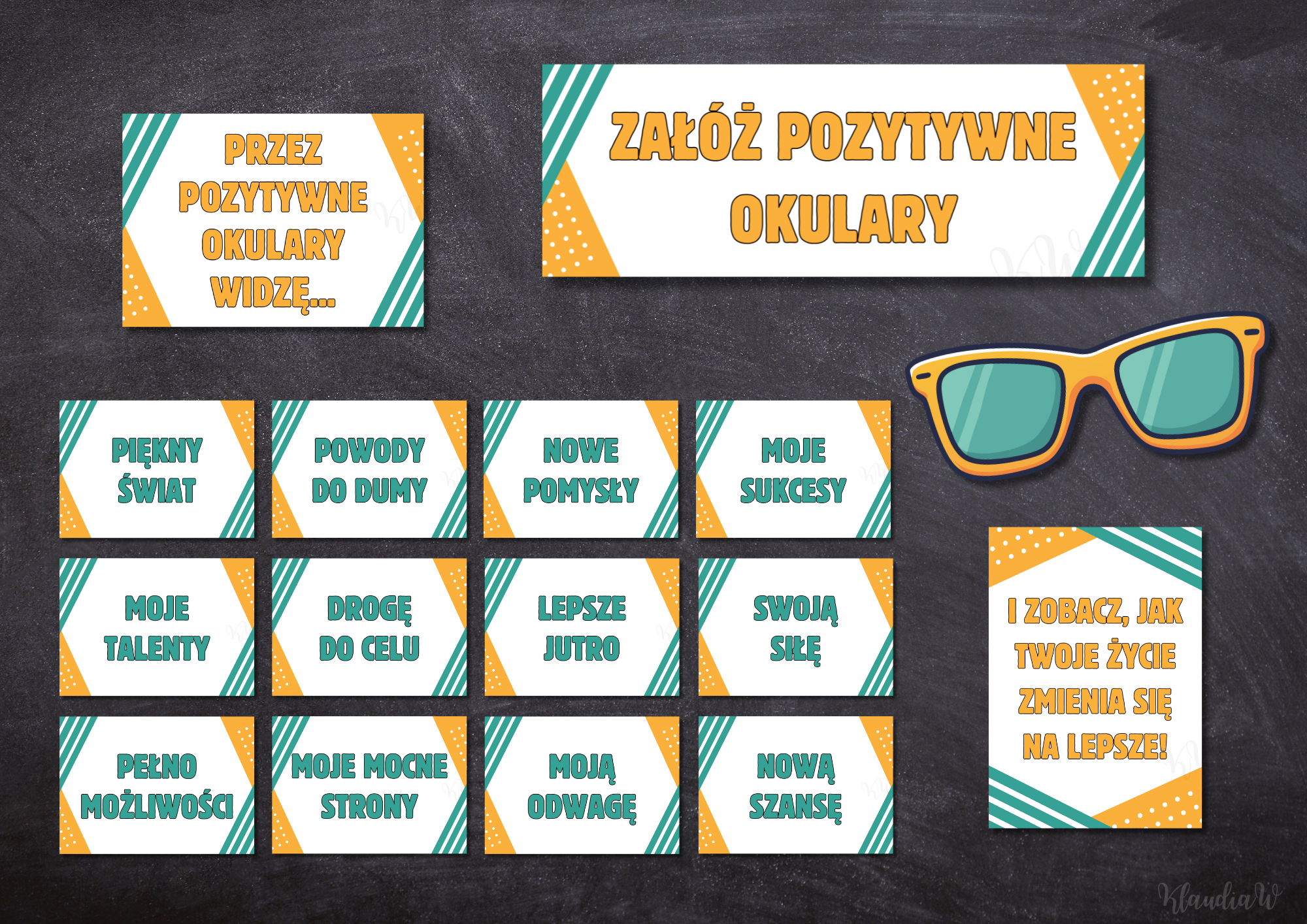 Dzień Pozytywnego Myślenia to coś więcej niż tylko data w kalendarzu – to idealny moment, by zatrzymać się z uczniami i pokazać im, jak wielką moc ma ich nastawienie. Przygotowałam zestaw „Pozytywne Okulary”, który zamieni zwykłą tablicę w inspirującą lekcję optymizmu. W zestawie: - plansza z napisem głównym „ZAŁÓŻ POZYTYWNE OKULARY” - na 2 kartkach A4 (do sklejenia), - okulary dekoracyjne - z 2 kartek A4 (po sklejeniu mają ok. 35 cm szerokości), - plansze o formacie A4 : „I ZOBACZ, JAK TWOJE ŻYCIE ZMIENIA SIĘ NA LEPSZE!” oraz „PRZEZ POZYTYWNE OKULARY WIDZĘ...!”, - 12 plansz A5 z pozytywnymi hasłami: (m.in. „MOJE SUKCESY” , „PIĘKNY ŚWIAT” (każda plansza po wydrukowaniu ma ok. 18,5 cm x 13 cm). Załóżcie „Pozytywne Okulary” i zobaczcie, jak pięknie wygląda świat!