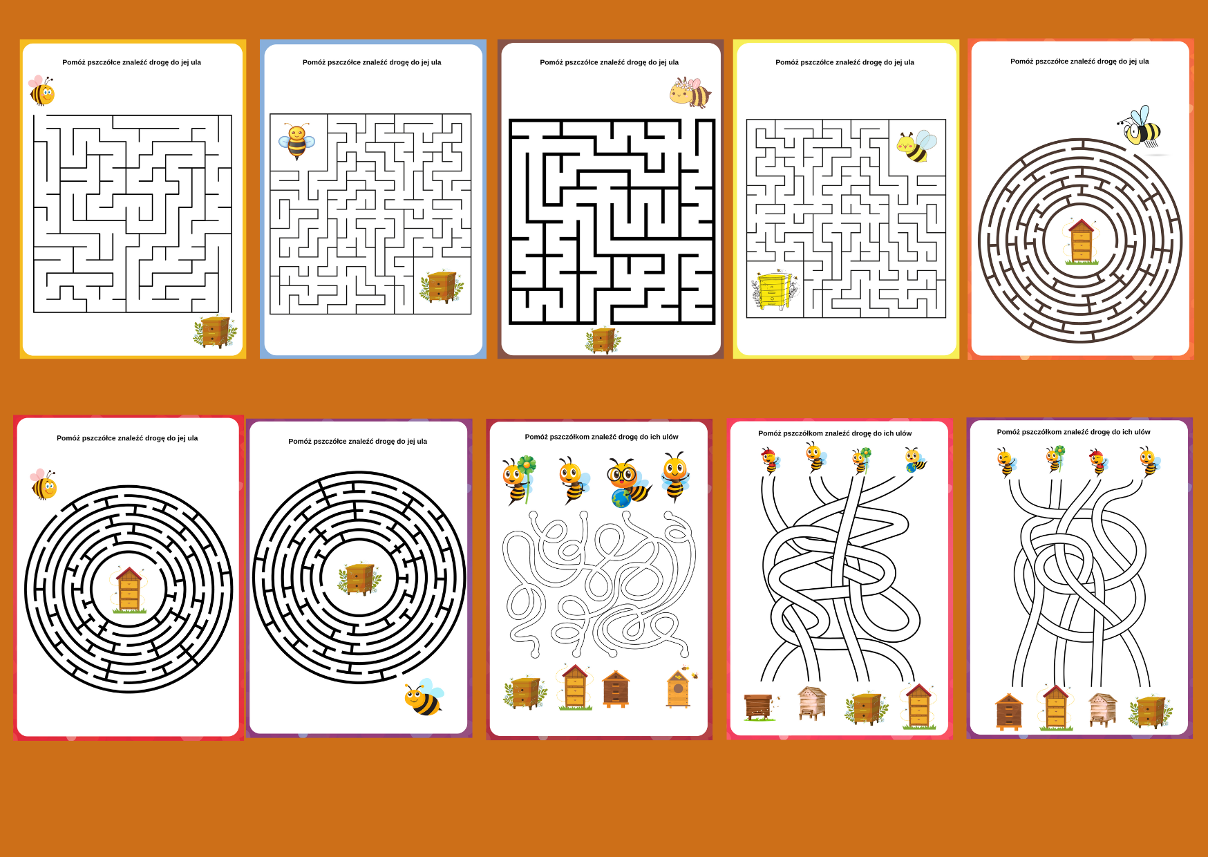 Zestaw labiryntów idealnych na Dzień Pszczół i nie tylko. 10 wersji o różnym poziomie trudności, każdy w formacie A4 (można oczywiście zmniejszyć format podczas drukowania).
