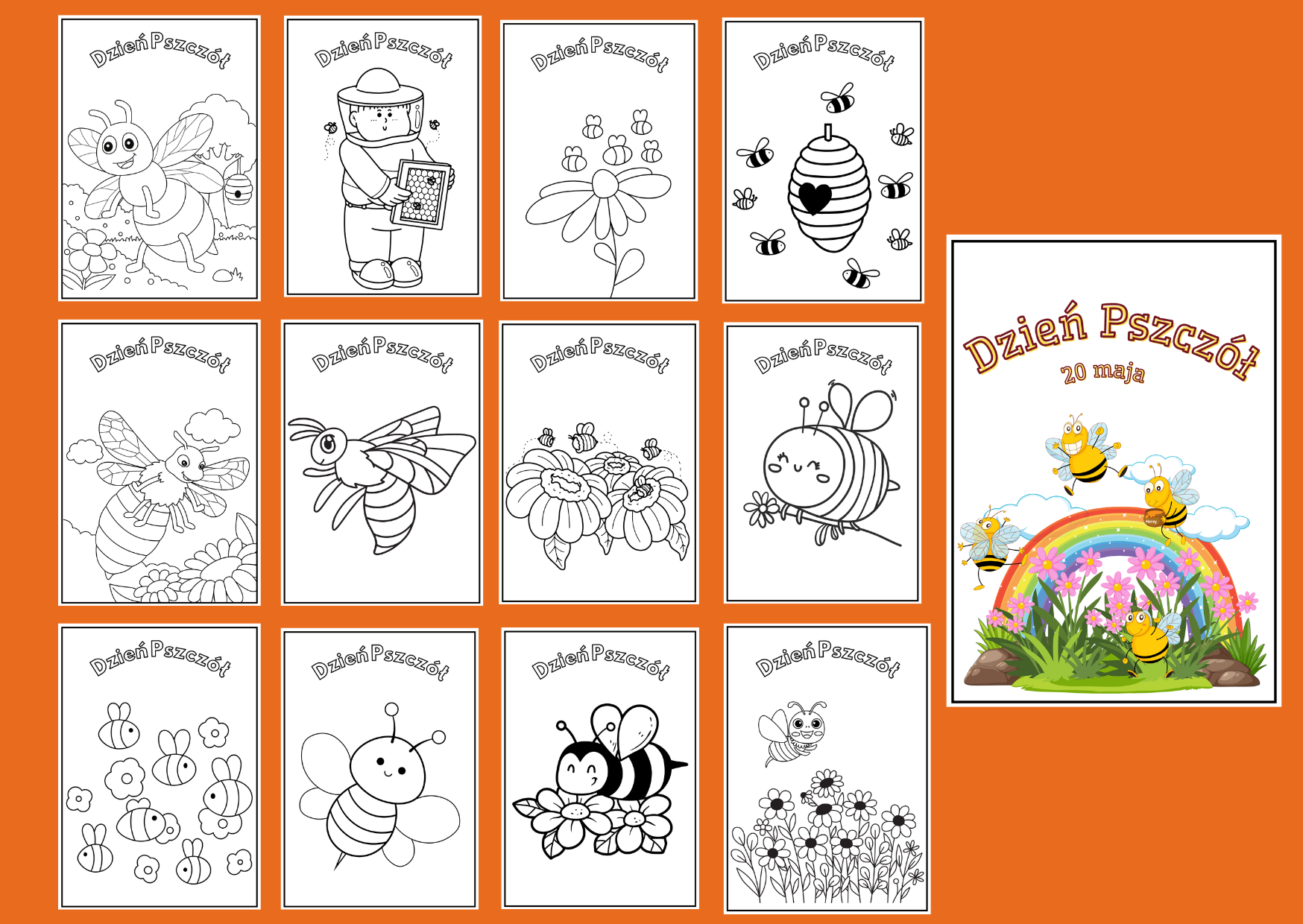 Materiał zawiera 25 kolorowanek z napisem „Dzień Pszczół” oraz ilustracjami związanymi z tym dniem oraz stronę tytułową. Po pomalowaniu przez dzieci kolorowanek, można stworzyć gazetkę – klasową. Wszystkie karty mają format A4.