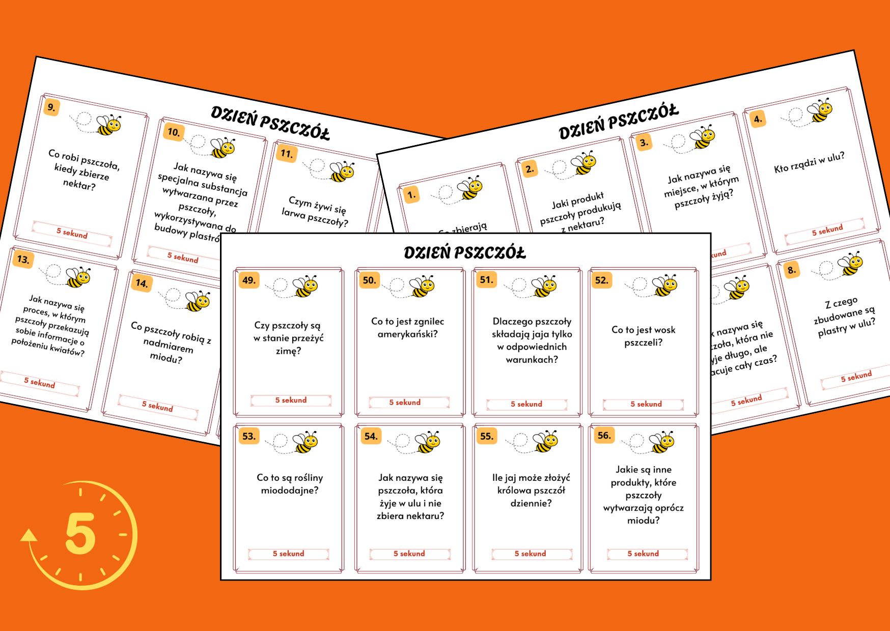 Zestaw 7 kart (format A4 pdf) z 56 karteczkami do gry typu „5 sekund”, zawierającymi pytania dotyczące pszczół. Do gry dodałam propozycje odpowiedzi.