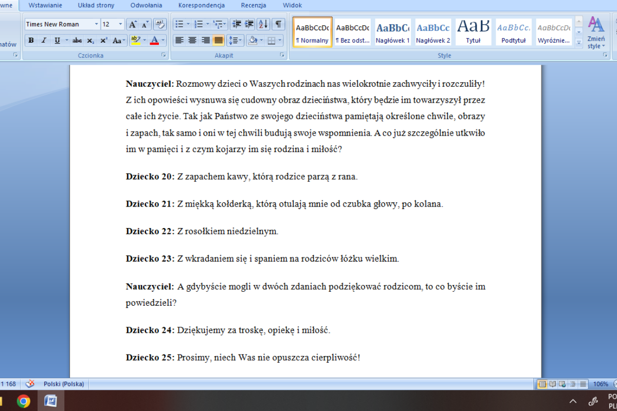 Całość rozpoczyna się kilka dni przed występem, gdy nauczyciel wręcza dzieciom wydrukowane podstawy laurek (dołączone do materiału). Znajduje się w nich kilka miejsc do uzupełnienia przez dzieci, np.: „ja jako bobas”, „moja rodzina”, „potrawa, która kojarzy mi się z rodziną”, „nasze miejsce na ziemi”, „lubię, gdy razem...”, „ulubione wspomnienie”.