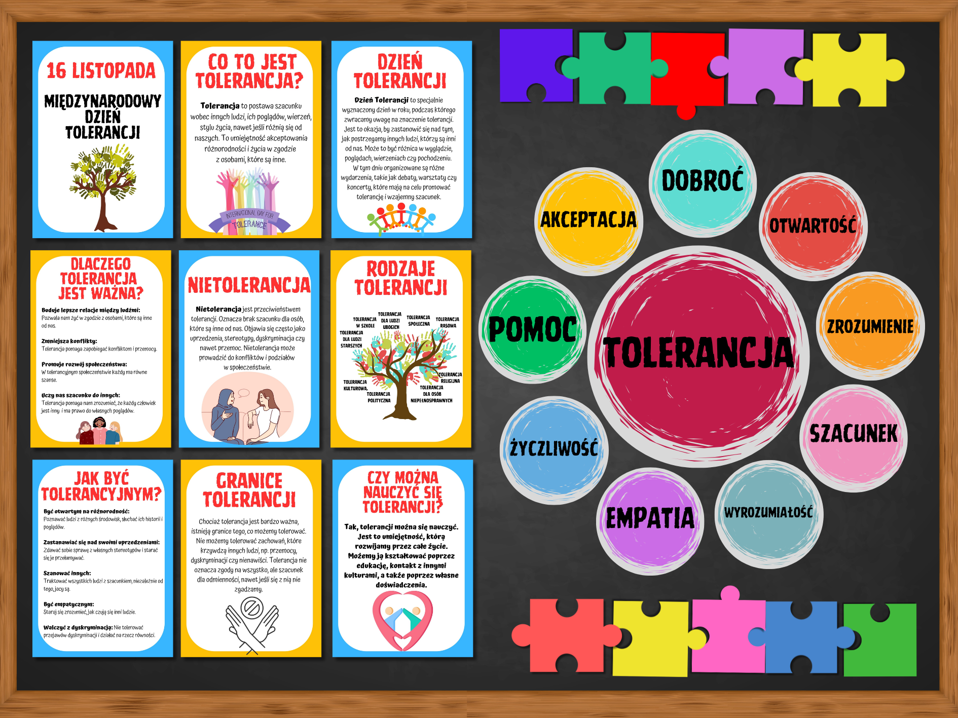 Zestaw materiałów do przygotowania gazetki z okazji Międzynarodowego Dnia Tolerancji. W skład zestawu wchodzi: