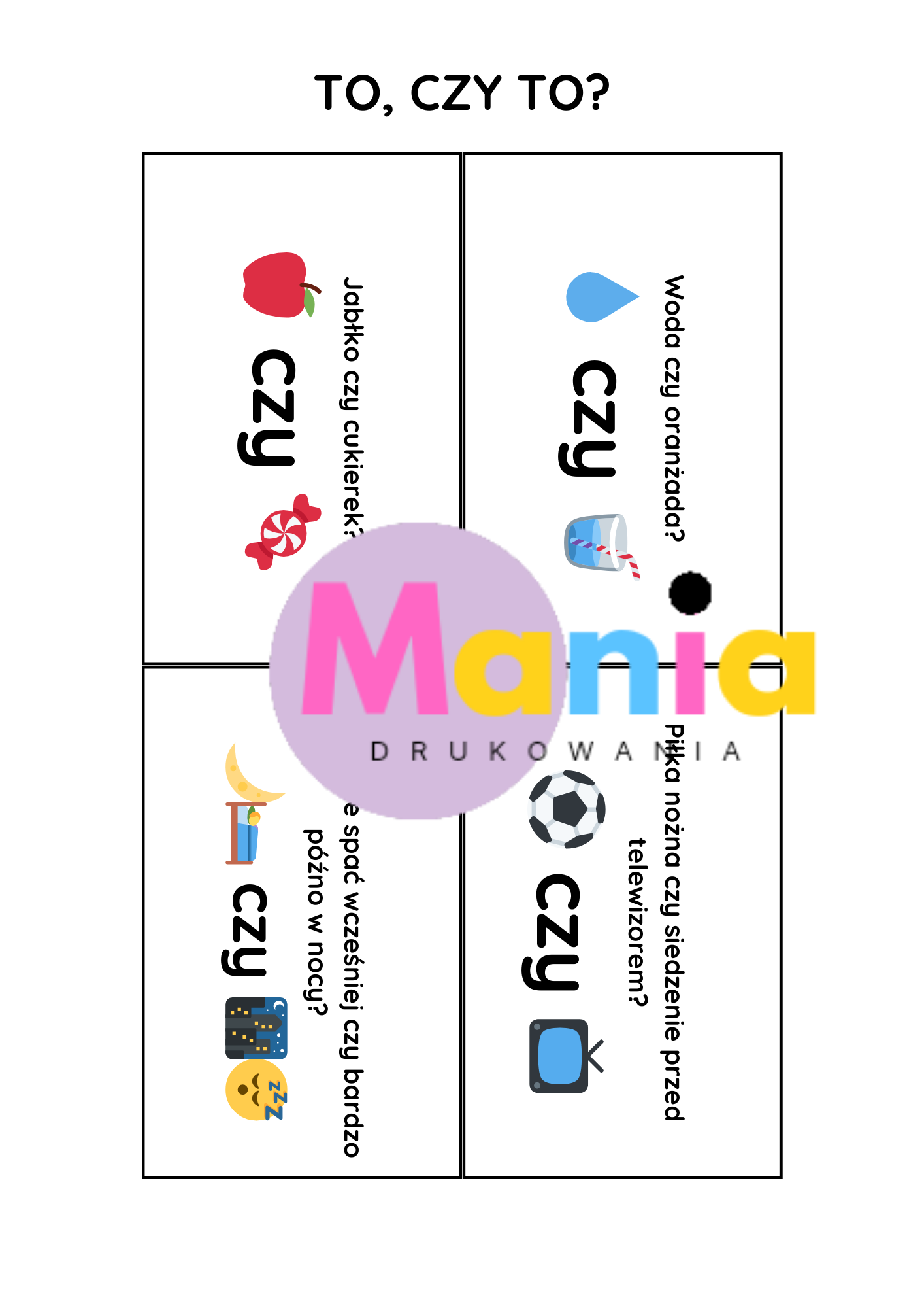 Mania Drukowania – kreatywne materiały edukacyjne do drukuW sklepie Mania Drukowania oferujemy starannie opracowane materiały PDF do samodzielnego wydruku, stworzone z myślą o nauczycielach, terapeutach, rodzicach oraz wszystkich, którzy pracują z dziećmi w wieku przedszkolnym i wczesnoszkolnym.Nasza oferta obejmuje m.in.: karty pracy i zadania rozwijające umiejętności dzieci, gry edukacyjne, zabawy ruchowe i pakiety tematyczne, dekoracje na święta, uroczystości przedszkolne i pory roku, zaproszenia i ozdoby na urodziny oraz inne okazje, kalendarze, girlandy, plakaty oraz dodatki do organizacji zajęć. Dlaczego warto wybrać Mania Drukowania?✔️ Materiały tworzone z dbałością o estetykę i wartość edukacyjną.✔️ Pomoc w organizacji zajęć, świąt i codziennej pracy z dziećmi.✔️ Jasne instrukcje, kolorowe grafiki i przyjazny styl pracy z dziećmi. Naszą misją jest wspieranie edukacji przez kreatywne i atrakcyjne rozwiązania gotowe do użycia – zawsze w duchu nauki przez zabawę.