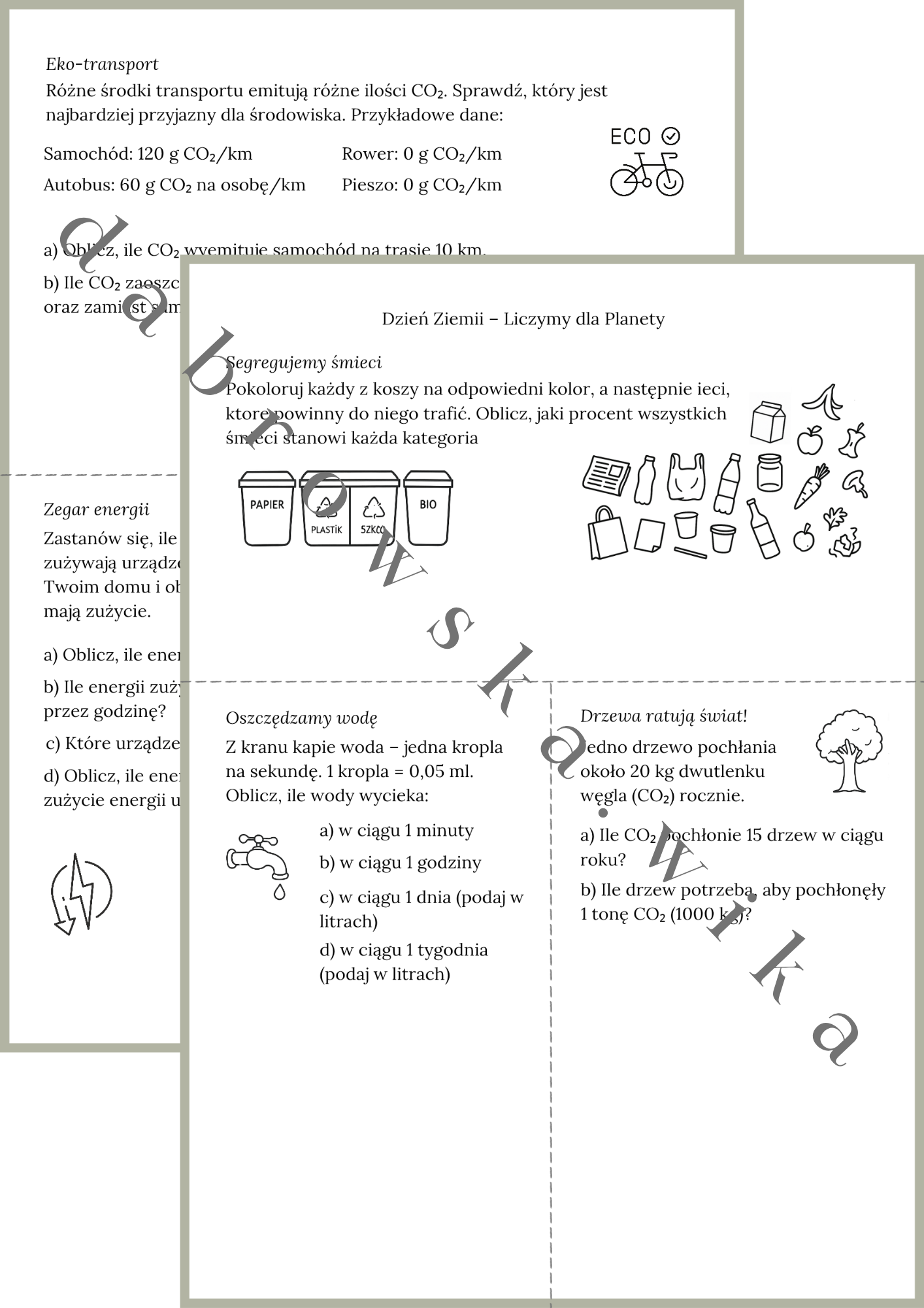 Zawiera zestaw zadań związanych z ekologią, ochroną środowiska oraz oszczędzaniem zasobów naturalnych.