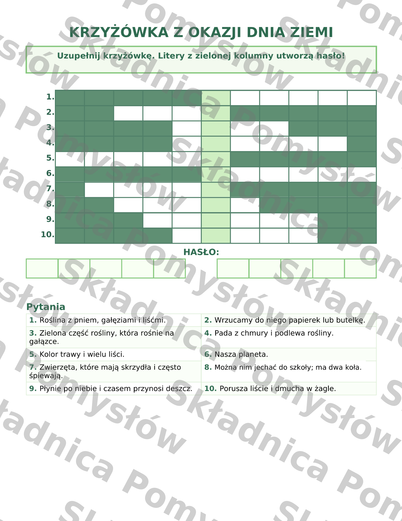 ✨ Materiał zawiera estetycznie przygotowaną kartę pracy w formie krzyżówki związanej z tematyką Dnia Ziemi. Zadaniem uczniów jest uzupełnienie haseł na podstawie prostych definicji i wskazówek, a następnie odczytanie hasła ukrytego w wyróżnionej kolumnie. Zestaw zawiera również stronę z odpowiedziami, co ułatwia szybkie sprawdzenie poprawności wykonania zadania.