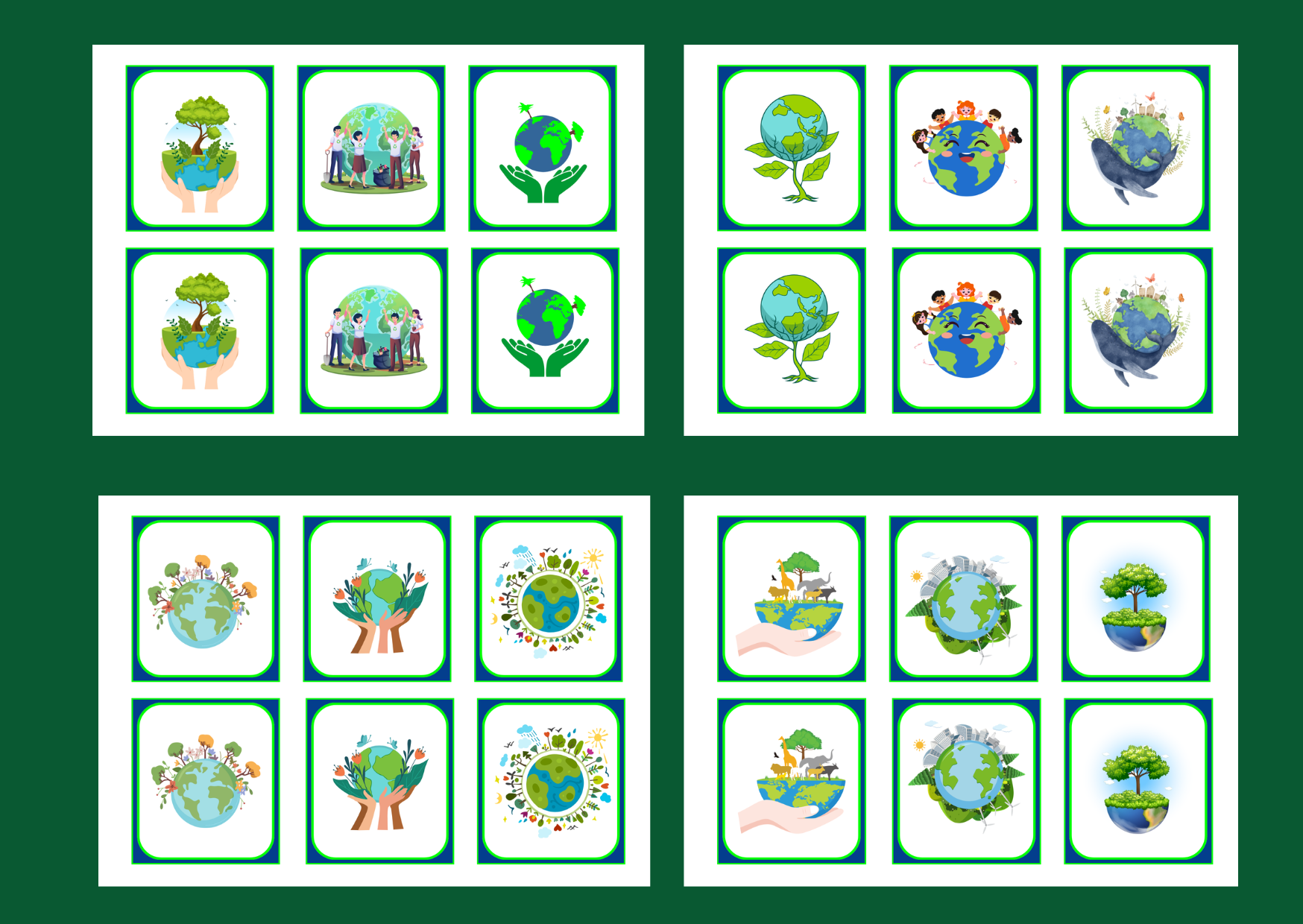 Gra memory uczy dzieci skupienia i koncentracji. Proponuję memory z ilustracjami związanymi z Dniem Ziemi (7 stron, na każdej po 6 ikonek).. Po wycięciu materiał można zalaminować, aby dłużej służył.