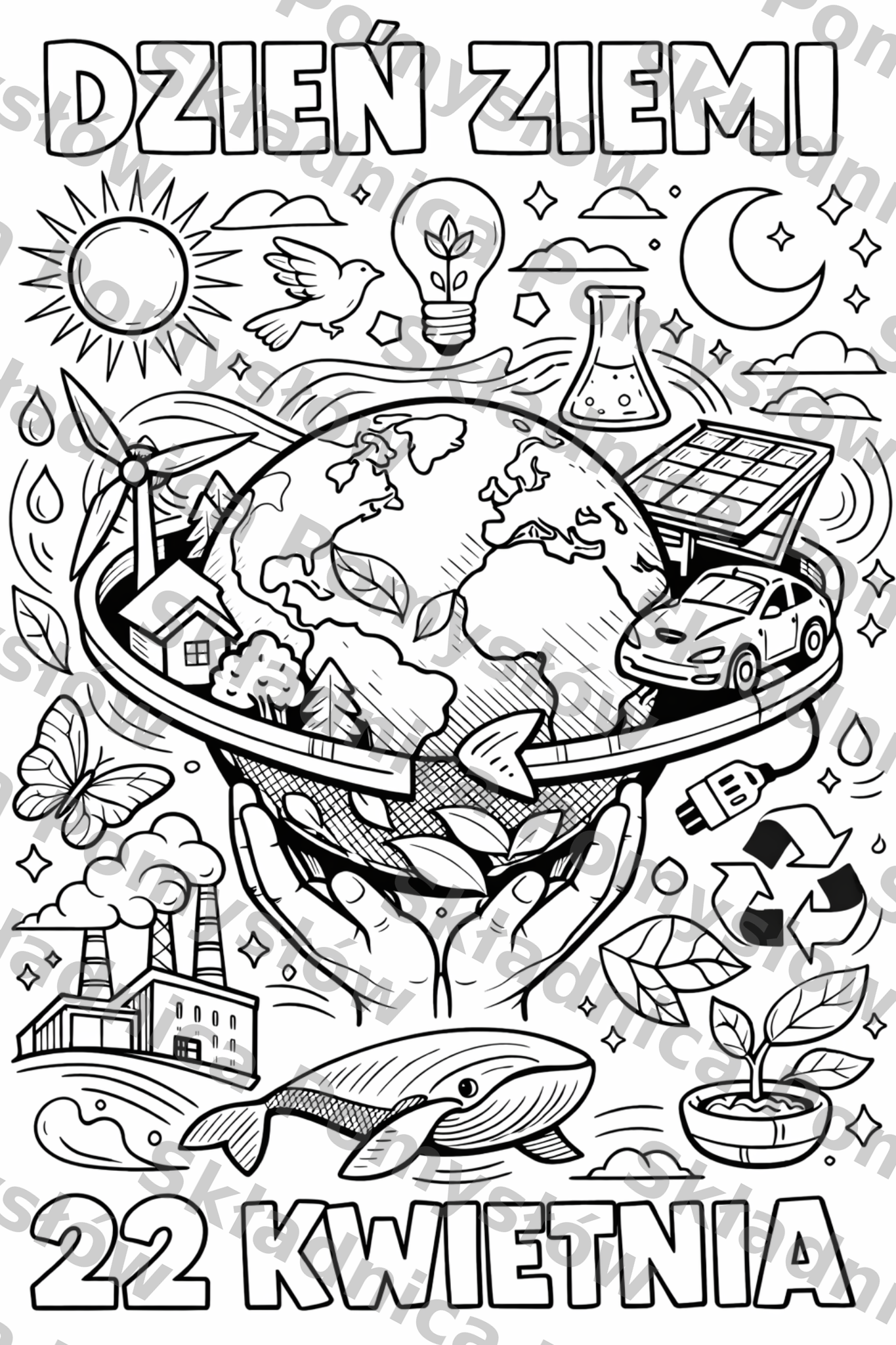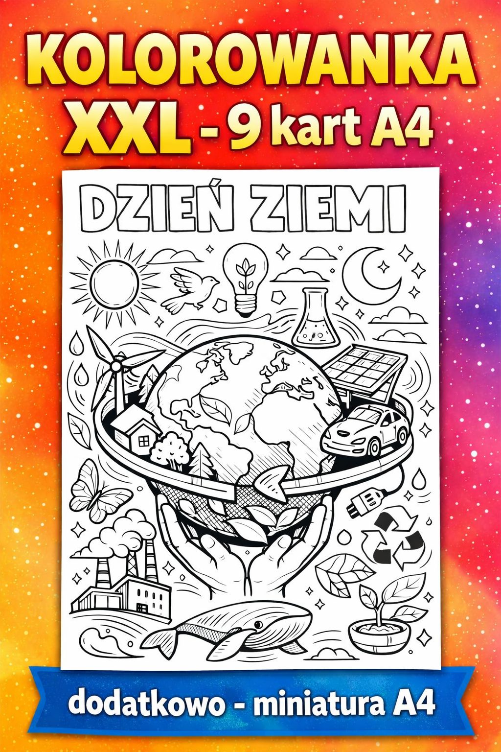 To estetyczny materiał do druku, który łączy funkcję dekoracyjną z edukacyjną. W pakiecie znajdują się 2 wersje tej samej grafiki: plakat w formacie A4 oraz wersja wielkoformatowa do złożenia z 9 kartek A4. Ilustracja przedstawia Ziemię trzymaną w dłoniach oraz liczne symbole związane z ekologią i ochroną środowiska, m.in. recykling, rośliny, energię odnawialną, wodę, zwierzęta i ekologiczny transport. Na plakacie widnieje także napis „Dzień Ziemi” oraz data „22 kwietnia”.