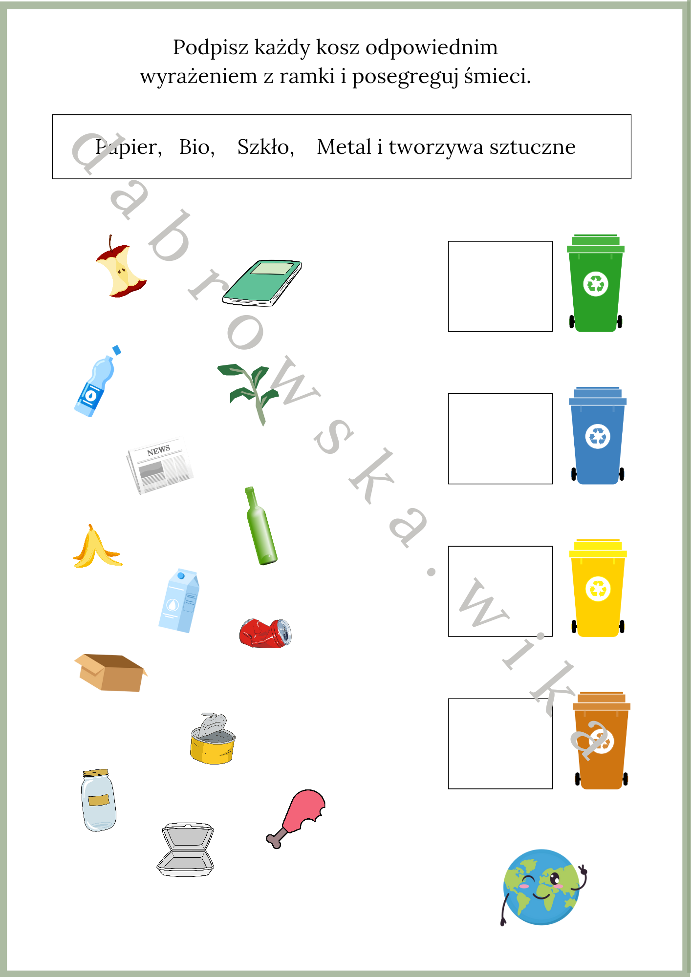 Materiał zawiera kartę pracę z okazji Dnia Ziemi dotyczącą segregacji śmieci.