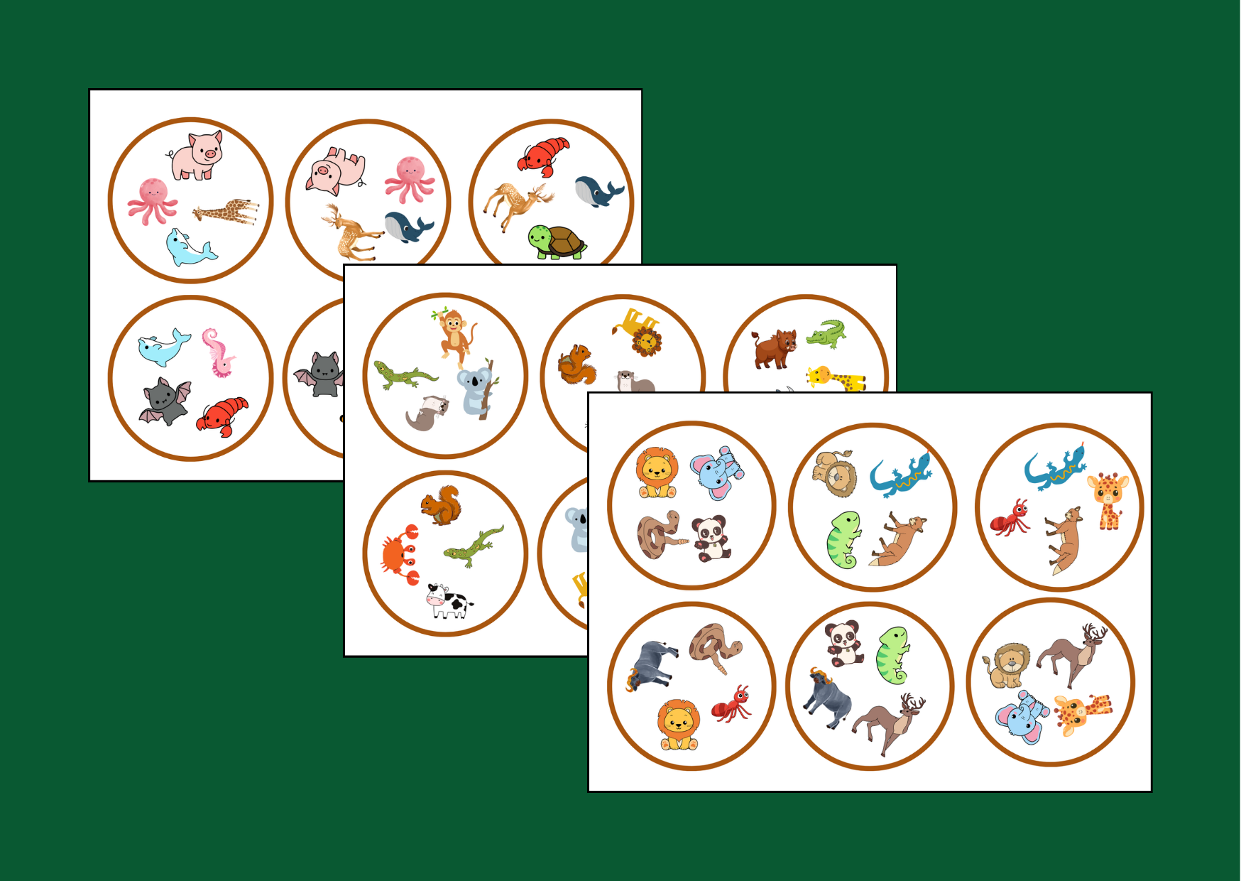 Zestaw zawiera 6 kart w wersji kolorowej. Na każdej karcie znajduje się 6 kół z obrazkami zwierząt. Po wycięciu materiał można zalaminować, aby dłużej służył. Można je wykorzystać na lekcji do ćwiczeń redakcyjnych, gramatycznych czy ortograficznych.