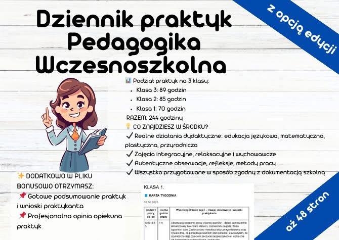 dziennik praktyk pedagogika wczesnoszkolna, gotowy dziennik praktyk, dziennik praktyk 240 godzin, praktyki nauczycielskie, dziennik pedagogika przedszkolna, praktyka w klasach 1-3, dokumentacja praktyk, wzór dziennika praktyk, zaliczenie praktyk pedagogicznych, podsumowanie i opinia o praktykancie, dziennik praktyk do edycji Word, dziennik praktyk do druku, praktyka nauczycielska bez stresu, praktyki z edukacji wczesnoszkolnej