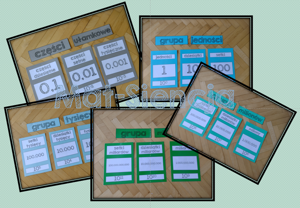 Zestaw plakatów do samodzielnego wykonania do powieszenia w sali zawierający grupy jedności, tysięcy, milionów, miliardów i części dziesiętnych oraz instrukcję wykonania plakatów z kolorowym tłem jak na zdjęciu.