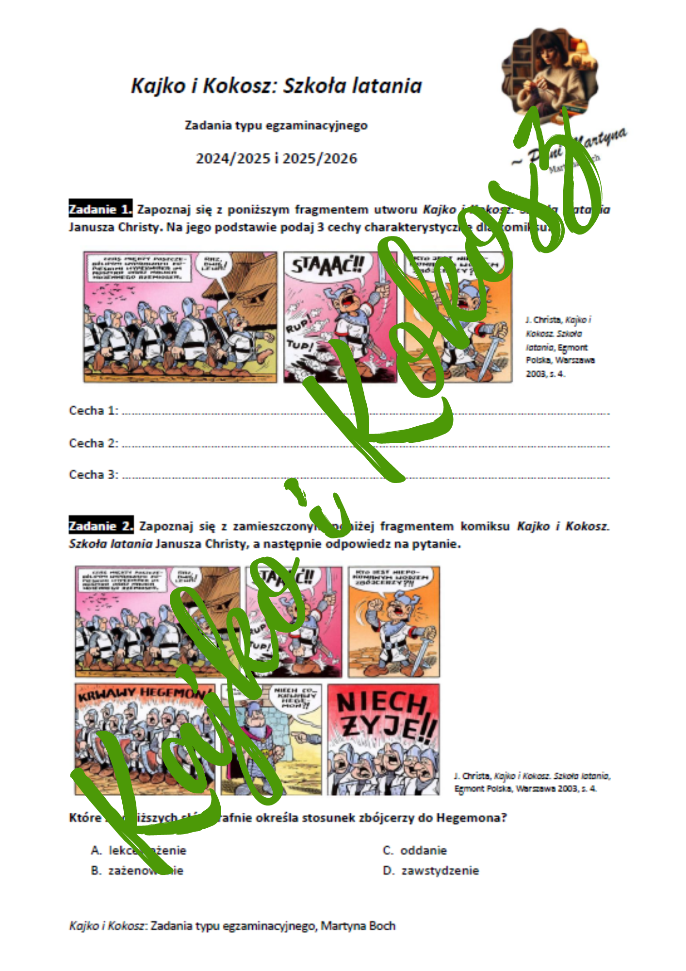 Oferuję zbiór 20 zadań typu egzaminacyjnego do fragmentów lektury "Kajko i Kokosz. Szkoła latania" Janusza Christy. Zbiór jest dostosowany do wymagań egzaminacyjnych obowiązujących w latach 2024/2025 i 2025/2026.