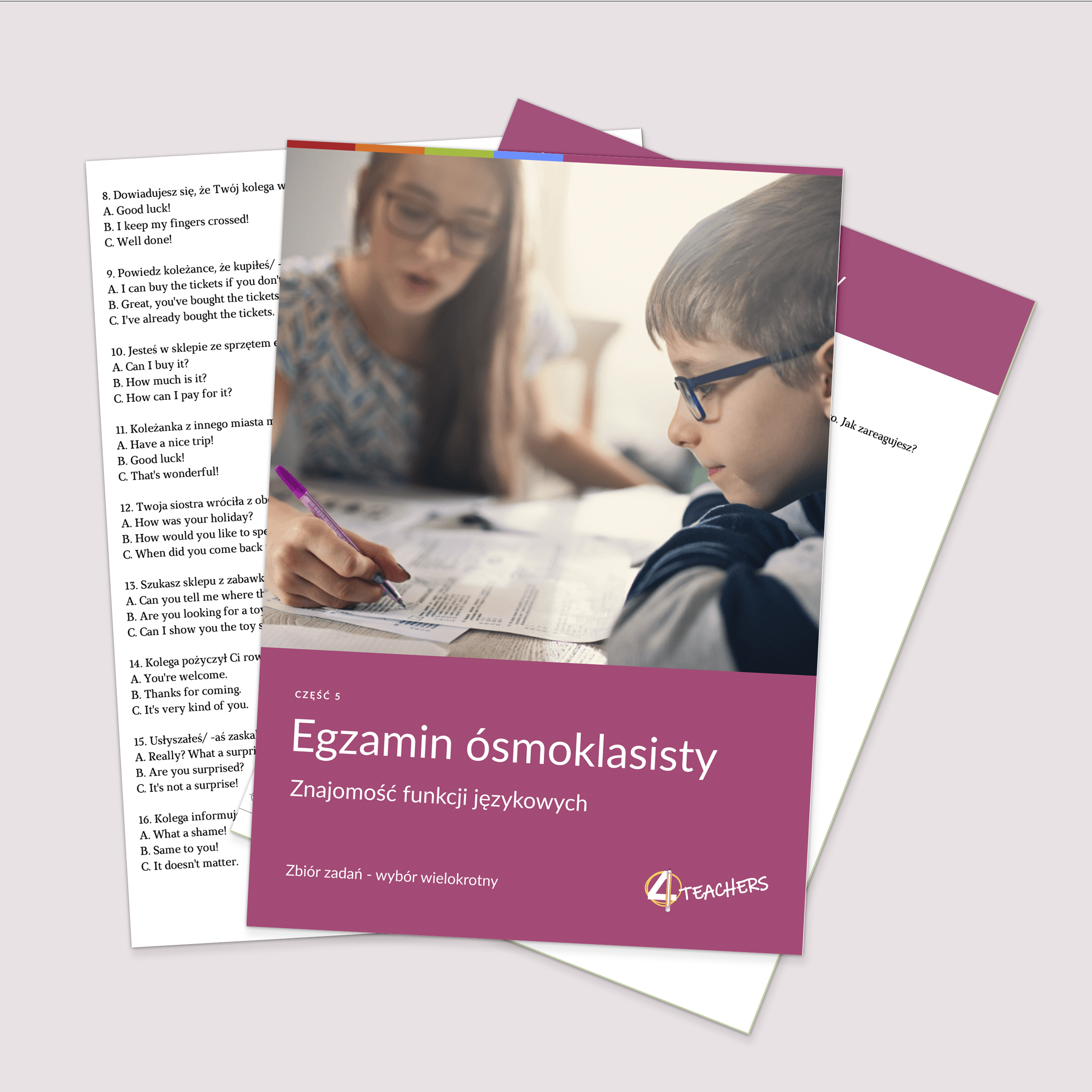 Wykorzystanie naszego zestawu "Znajomość funkcji językowych- WYBÓR WIELOKROTNY" czyni przygotowania do egzaminu ósmoklasisty bardziej kompleksowymi i efektywnymi. Daj swoim uczniom szansę na maksymalne wykorzystanie ich potencjału i osiągnięcie gruntownej znajomości języka angielskiego.