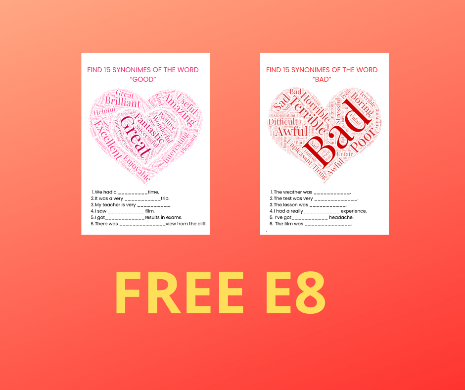 Na bazie praktycznej listy słów stworzyłam czytelne, atrakcyjne wizualnie chmury wyrazowe, które pomagają uczniom szybko zapamiętać lepsze zamienniki zamiast ciągłego good i bad.