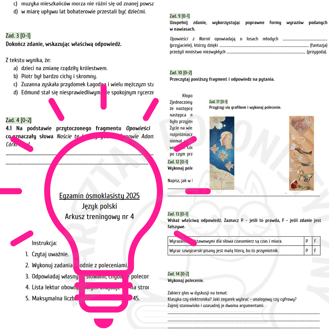 "Opowieści z Narnii" lektura-zagadka – „Latarnik”, słynne polskie zegarki, zaproszenie, gramatyka, rozprawka, przemówienie. Arkusz poleca się na diagnozy, sprawdziany i – przede wszystkim – ćwiczenia.