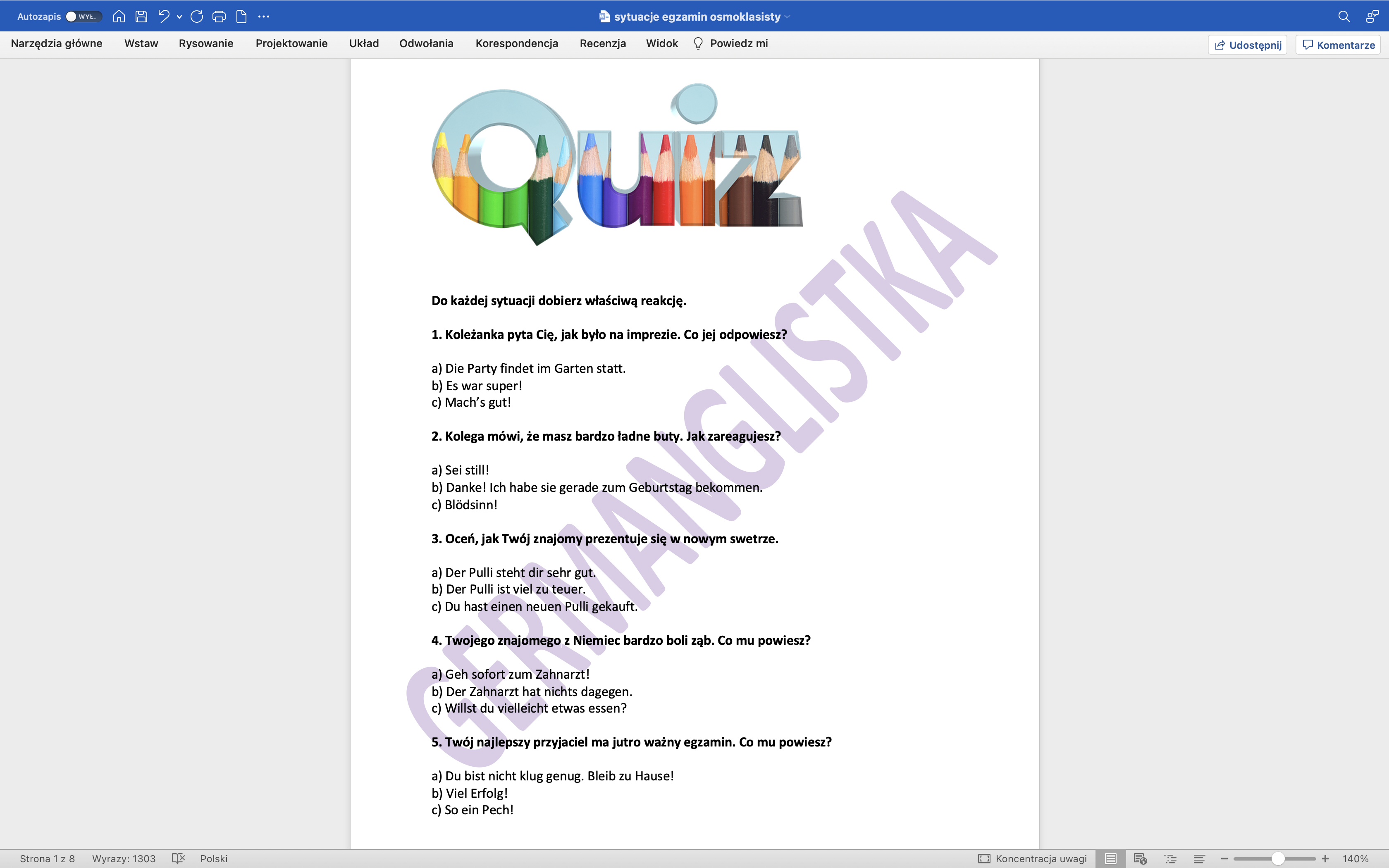 Egzamin Ósmoklasisty- j. niemiecki - Dobieranie reakcji do sytuacji - aż 50 pytań z odpowiedziami do wyboru + klucz.