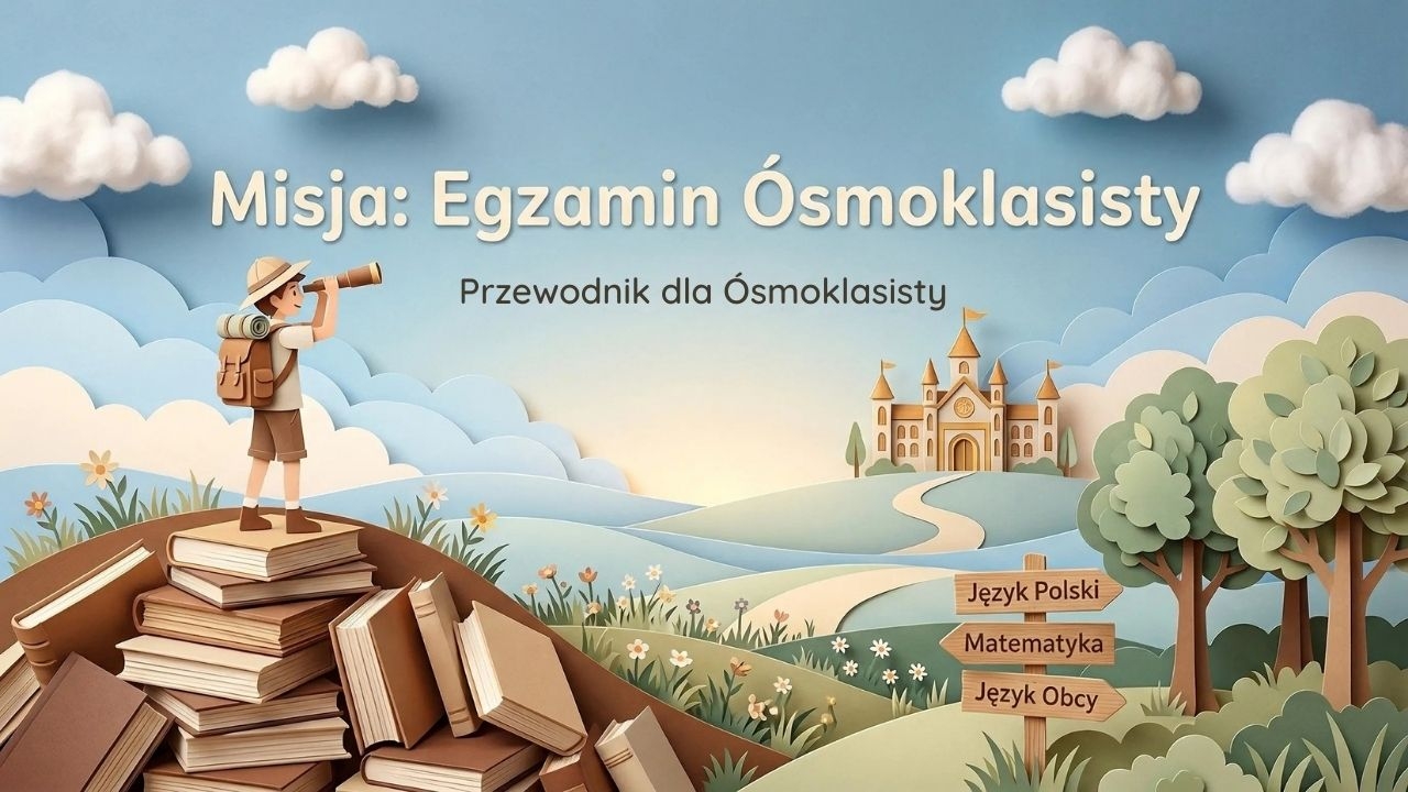 To dopracowany wizualnie materiał w formie prezentacji/gazetki PDF, który prowadzi ucznia przez przygotowania do egzaminu ósmoklasisty w konwencji „misji” i czytelnej mapy drogi. Zestaw zawiera 1 plik PDF i 20 stron/20 plansz. Materiał zaczyna się okładką „Misja: Egzamin Ósmoklasisty” (str. 1) oraz krótkim wprowadzeniem, które oswaja egzamin i pokazuje go jako ważny etap w drodze do wymarzonej szkoły (str. 2). Następnie uczeń otrzymuje konkrety organizacyjne: strukturę egzaminu i czasy trwania poszczególnych części (język polski 150 min, matematyka 125 min, język obcy 110 min) (str. 3) oraz wyjaśnienie, dlaczego wynik ma znaczenie w rekrutacji i jak potraktować go jako trampolinę rozwojową (str. 4). Kolejny blok dotyczy języka polskiego: analiza i interpretacja, czytanie ze zrozumieniem oraz tworzenie wypowiedzi pisemnej (str. 5). Materiał porządkuje także lektury obowiązkowe w dwóch częściach – jako szybka ściąga do powtórek (str. 6–7) oraz pokazuje „mistrzostwo form wypowiedzi” (opowiadanie, rozprawka, zaproszenie i inne formy użytkowe) wraz z kluczowymi zasadami struktury, języka i spójności (str. 8). Następnie przechodzi do matematyki: wprowadza myślenie logiczne i rozwiązywanie problemów (str. 9), podaje kluczowe działy (algebra i arytmetyka, geometria, statystyka i prawdopodobieństwo) (str. 10), uczy strategii rozwiązywania zadań otwartych krok po kroku (pokazywanie toku rozumowania, pełne zdania z jednostkami) (str. 11) oraz daje praktyczne strategie pracy z arkuszem (uważne czytanie, rysunki pomocnicze, sprawdzanie obliczeń i zarządzanie czasem) (str. 12). Część językowa skupia się na komunikacji w praktyce (rozumienie ze słuchu, czytanie, środki językowe, pisanie) (str. 13) oraz na tworzeniu tekstów użytkowych w języku obcym (np. e-mail, blog, zaproszenie) z jasnymi zasadami stylu i struktury (str. 14). Materiał podpowiada też skuteczne metody pracy nad słownictwem i gramatyką (fiszki, aplikacje, materiały autentyczne, regularność) (str. 15). Ostatnie plansze wzmacniają organizację i dobrostan: planowanie i systematyczność (str. 16), aktywne metody nauki (mapy myśli, quizy/testy, arkusze z poprzednich lat) (str. 17), przygotowania dzień przed egzaminem (regeneracja, sen, zakończenie nauki o sensownej porze) (str. 18), spokój i koncentrację w dniu egzaminu (poranek, zachowanie w szkole, oddech i proste techniki relaksacyjne) (str. 19) oraz finałowe, wzmacniające „Powodzenia, Ósmoklasiści!” (str. 20).