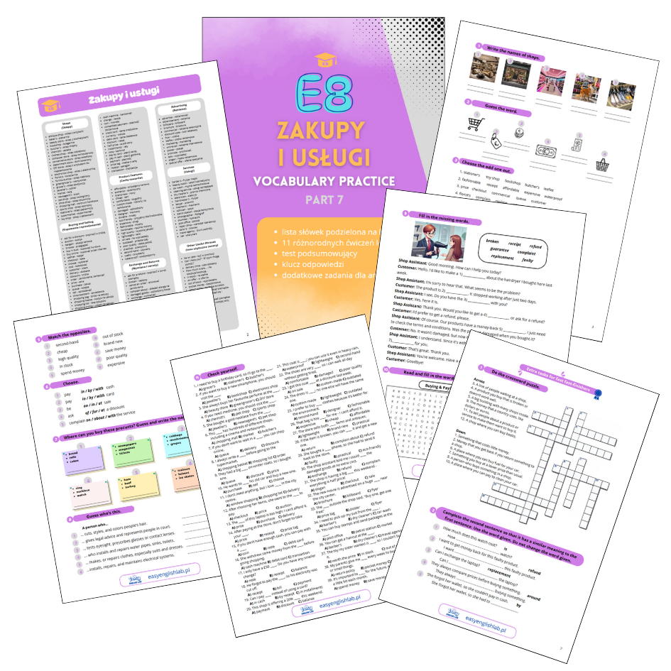 listę wymaganego słownictwa z podziałem na kategorie: sklepy, kupowanie i sprzedawanie, płacenie, cechy towarów, wymiana i zwroty, reklama, usługi, inne użyteczne zwroty