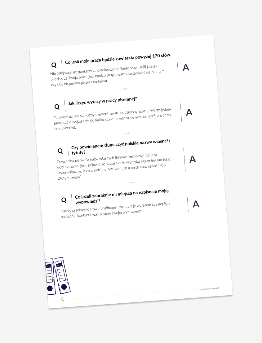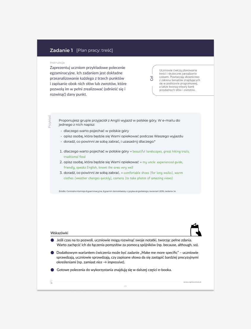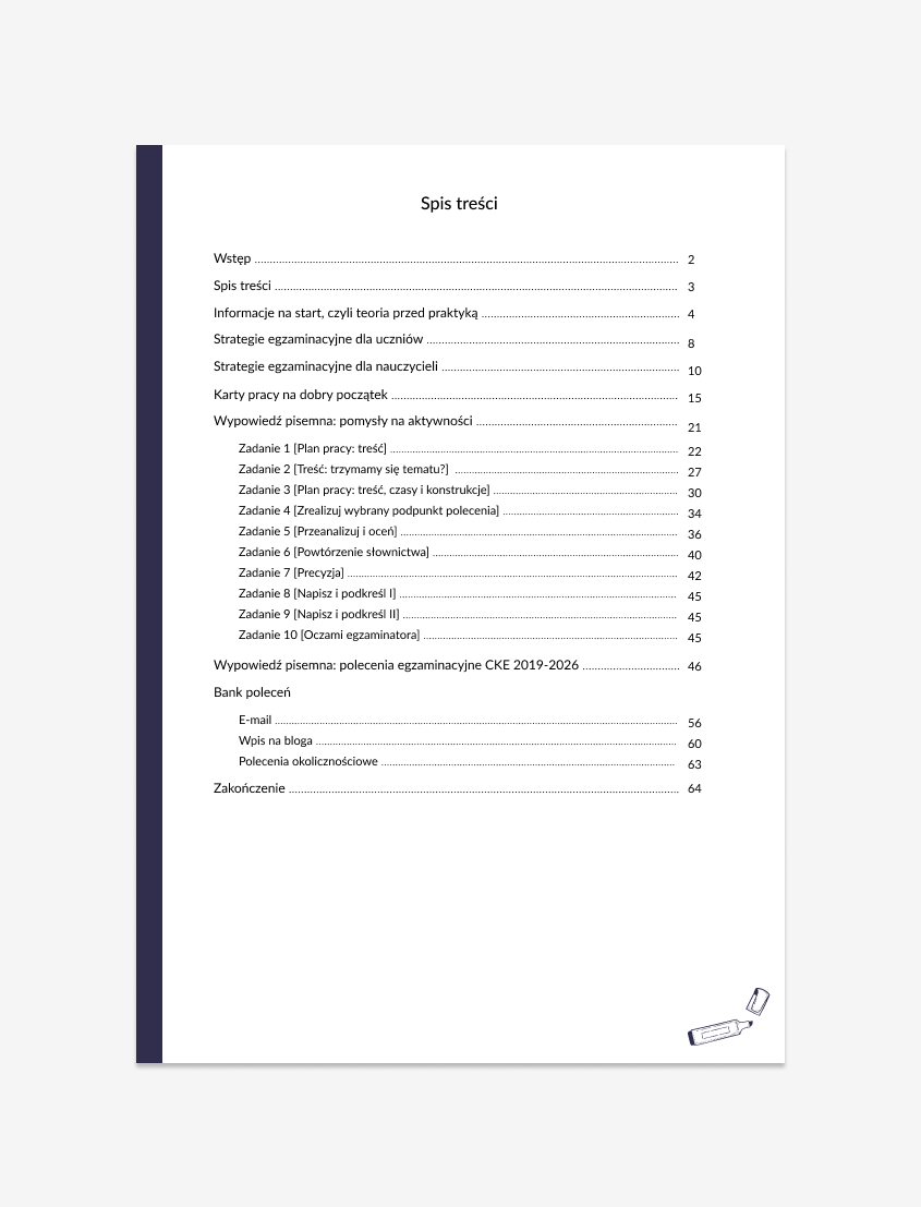 Workbook w formacie PDF – do samodzielnego wydrukowania lub korzystania w formie elektronicznej. Liczba stron: 65 Z własnego doświadczenia wiem, jak trudne bywa łączenie realizacji podstawy programowej z przygotowaniem uczniów do pisania, szczególnie, gdy czasu jest niewiele, a potrzeby duże. To doświadczenie stało się punktem wyjścia do stworzenia tego e-booka. Pokazuję w nim, jak krok po kroku przygotować uczniów do samodzielnego pisania dłuższych wypowiedzi, budując solidne podstawy, z uwzględnieniem realiów szkolnej codzienności. Ósmoklasiści potrzebują systematycznego podejścia, zrozumienia wymagań oraz wielu okazji do ćwiczeń, i właśnie to znajdziesz w tym e-booku. Co czeka w środku? Teoria przed praktyką To gotowe zestawienie najczęstszych pytań uczniów wraz z odpowiedziami stworzonymi wyłącznie na podstawie informacjach znajdujących się na stronie CKE. Strategie dla uczniów Czasami wystarczy jedna dobra wskazówka, aby nasi uczniowie zyskali dodatkowy punkt. Strategie dla nauczycieli Skupiam się na tym, co rzeczywiście pomaga pisać lepiej i co realnie ułatwia pracę w klasie. Karty pracy na dobry początek Zadania gotowe do druku. Wypowiedź pisemna: 10 pomysłów na aktywności To serce e-booka. Każde ćwiczenie zostało zaprojektowane tak, aby można je było swobodnie skracać lub wydłużać, w zależności od czasu, którym dysponujesz. Każdą aktywność otwiera strona z instrukcją i przykładem dla nauczyciela, po której znajdziesz gotowe materiały do skserowania dla uczniów. Przy wybranych ćwiczeniach dostępne są również szablony do wielokrotnego wykorzystania. Polecenia egzaminacyjne CKE 2019–2026 Terminy główne, dodatkowe oraz egzaminy próbne - wszystko w jednym miejscu. Bank poleceń Gotowe tematy: e-mail, wpis na blogu oraz polecenia okolicznościowe.