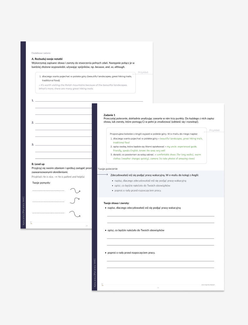 - Wypowiedź pisemna: 10 pomysłów na aktywności To serce e-booka. Każde ćwiczenie zostało zaprojektowane tak, aby można je było swobodnie skracać lub wydłużać, w zależności od czasu, którym dysponujesz. Każdą aktywność otwiera strona z instrukcją i przykładem dla nauczyciela, po której znajdziesz gotowe materiały do skserowania dla uczniów. Przy wybranych ćwiczeniach dostępne są również szablony do wielokrotnego wykorzystania.