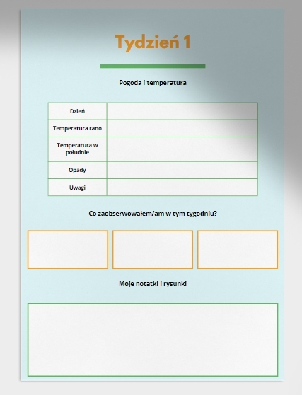 - Tygodniowe karty obserwacji – z miejscem na pogodę, gatunki roślin i zwierząt oraz notatki.
