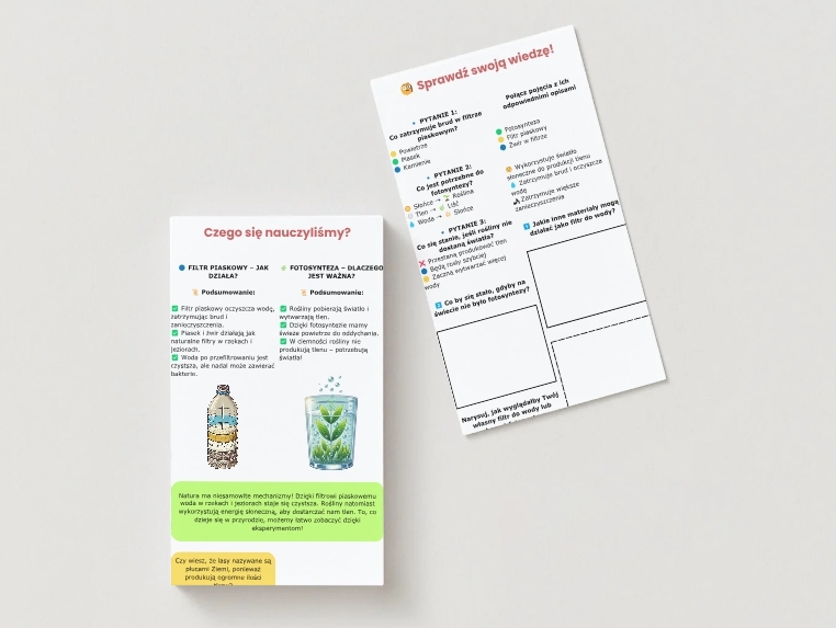 📘 „Eksperymenty przyrodnicze – Oczyszczanie wody i fotosynteza” to edukacyjny materiał dla dzieci i uczniów szkoły podstawowej, który w prosty i atrakcyjny sposób pokazuje, jak działa natura. Dzięki temu zasobowi dzieci będą mogły samodzielnie wykonać eksperymenty, obserwować zjawiska zachodzące w przyrodzie oraz sprawdzić swoją wiedzę w quizach i zadaniach.