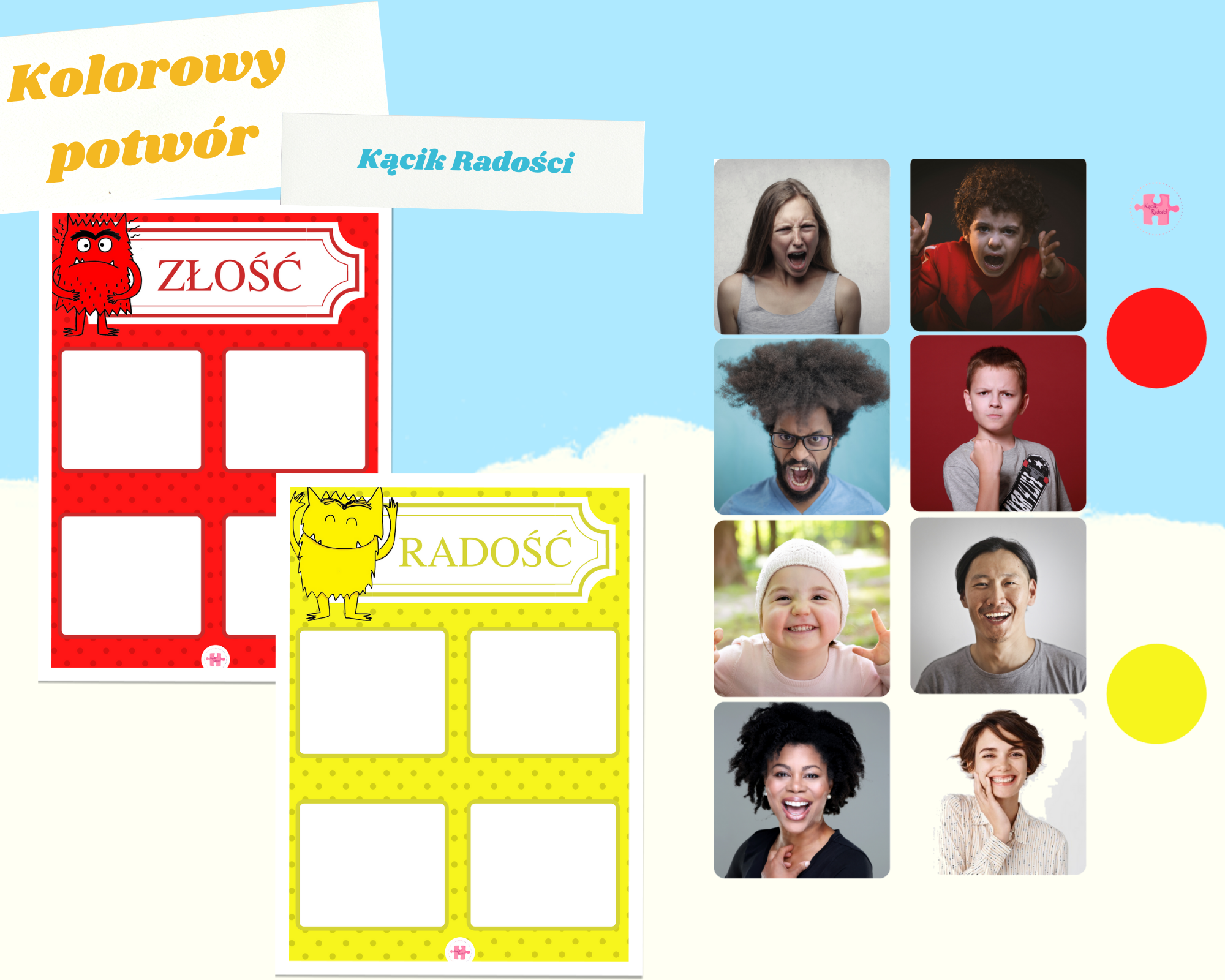 1. Plansze z emocjami (strach, smutek, radość, złość, spokój i miłość). Można wykorzystać jako tablice demonstracyjne oraz do zabaw - memory.