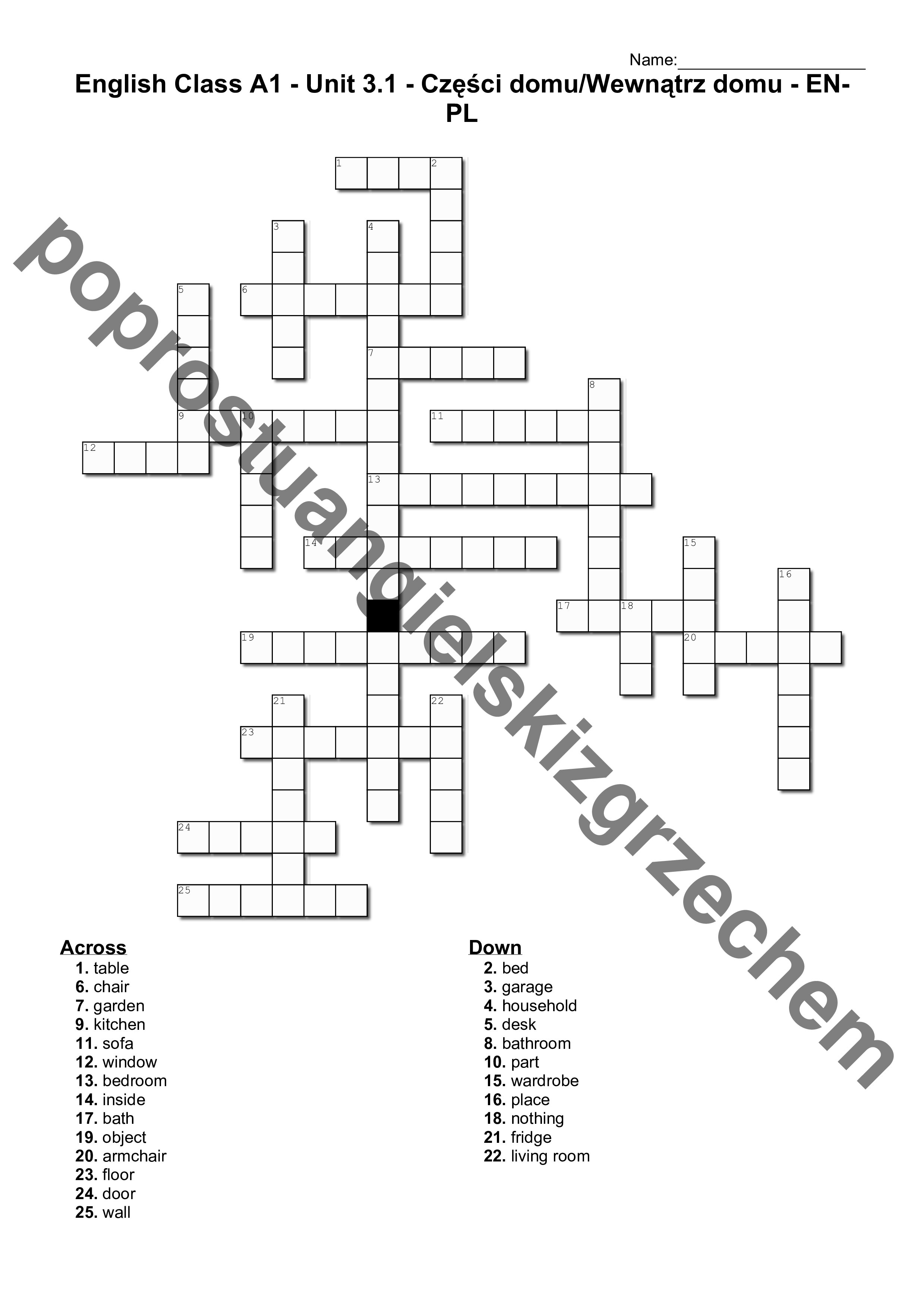 Zestaw zawiera łącznie 8 krzyżówek (4x PL-EN + 4x EN-PL) oraz klucz z odpowiedziami. Zakres słówek obejmuje dział trzeci z podręcznika English Class A1. Krzyżówki składają się od kilku (zwykle nie mniej niż 8) do maksymalnie 30 słówek.