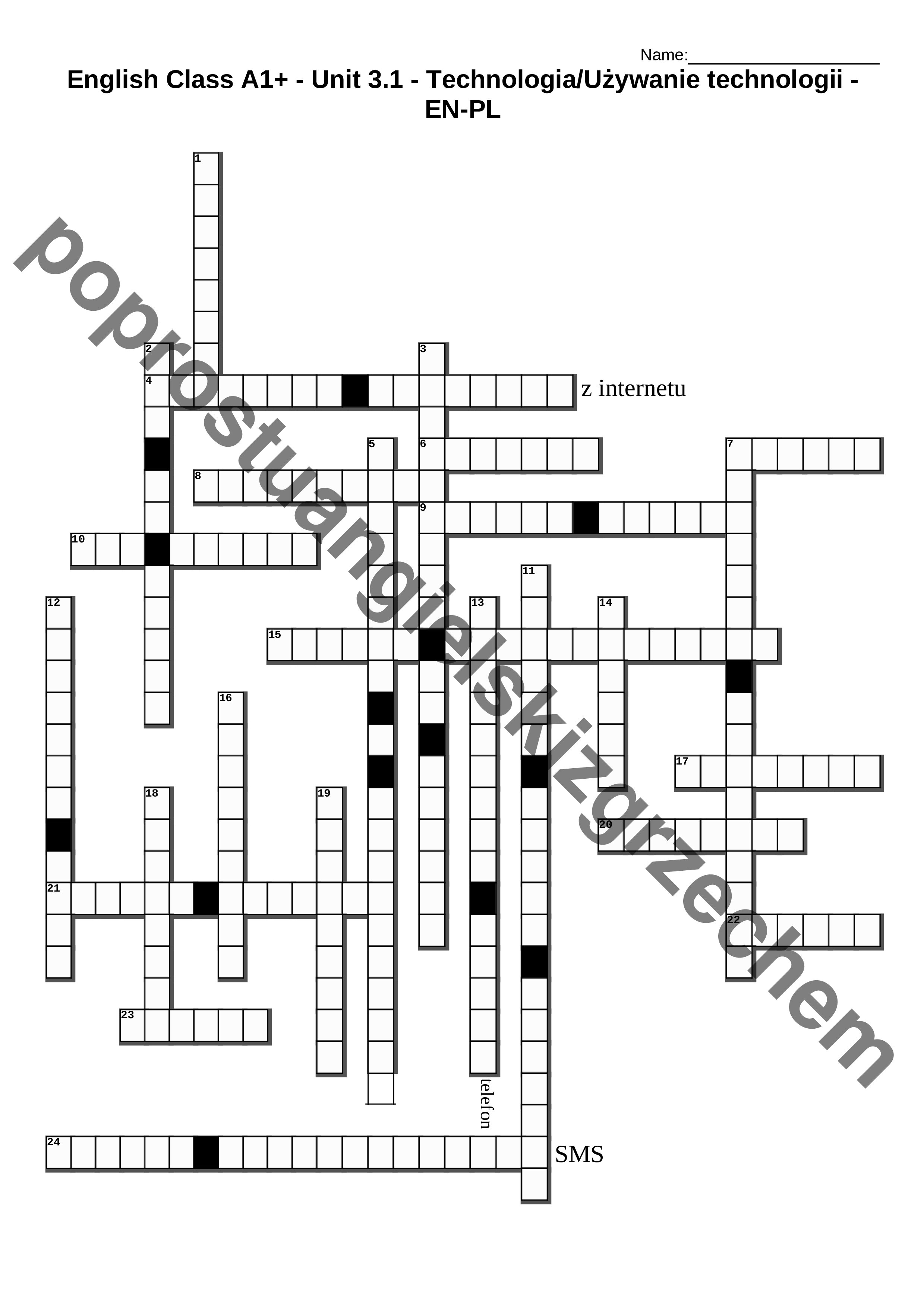 Zestaw zawiera łącznie 8 krzyżówek (4x PL-EN + 4x EN-PL) oraz klucz z odpowiedziami. Zakres słówek obejmuje dział trzeci z podręcznika English Class A1+. Krzyżówki składają się od kilku (zwykle nie mniej niż 8) do maksymalnie 30 słówek.