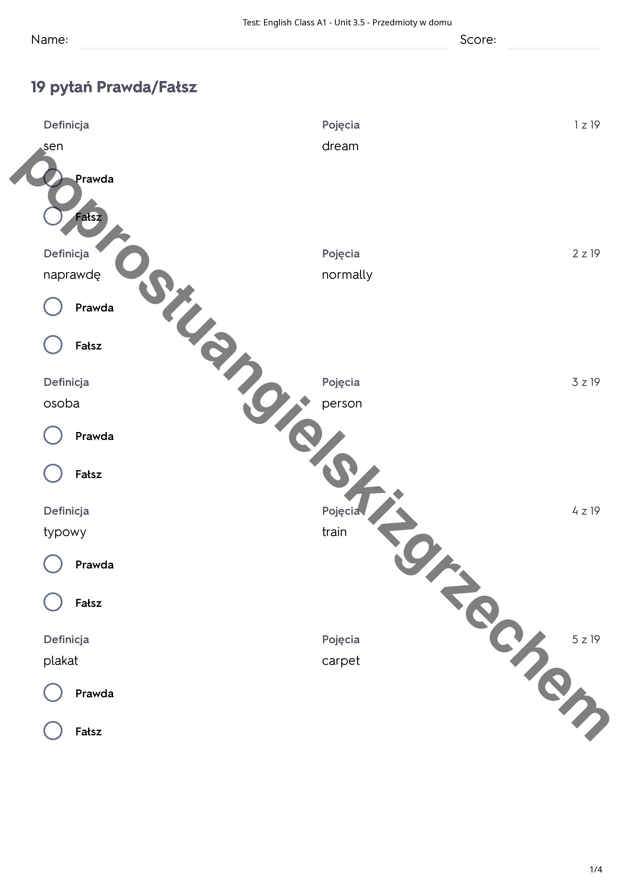 Zestaw zawiera 93 słówka z działu trzeciego do podręcznika English Class A1. Testy podzielone są na 5 podrozdziałów, a każdy z nich na 4 kategorie zadań (prawda/fałsz, dopasuj, wielokrotny wybór, pisemny)