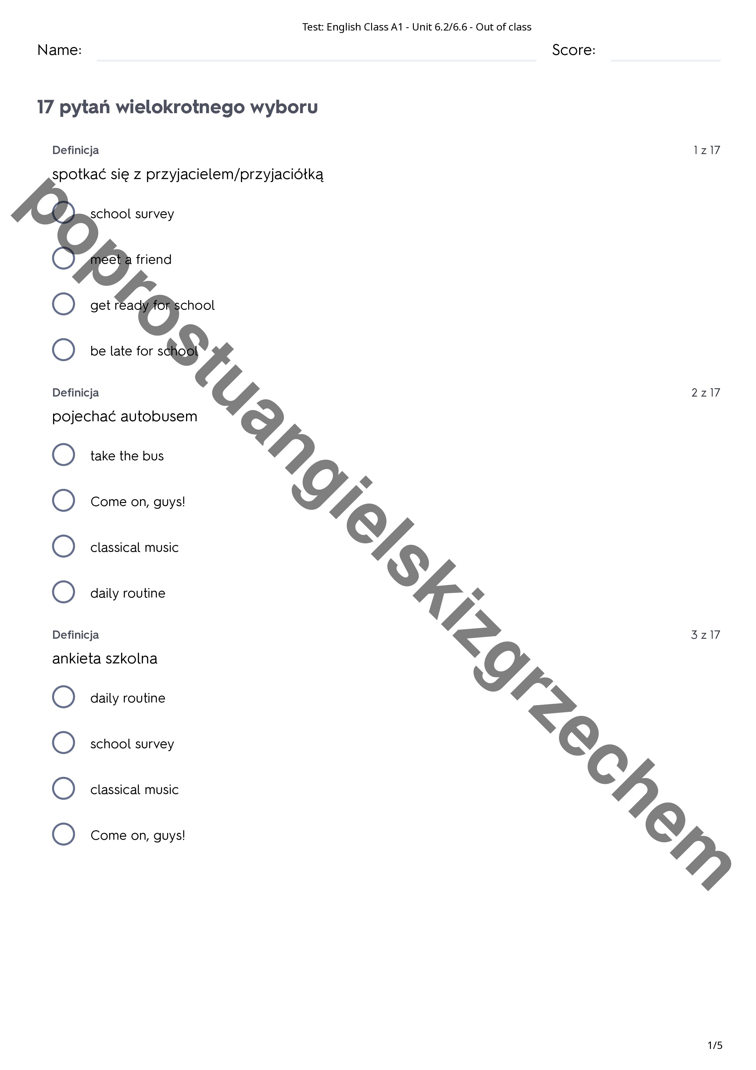Nie możesz znaleźć dodatkowych materiałów do danego podręcznika? Nie masz czasu na tworzenie testów z danego działu? Zaoszczędź sobie kłopotu i poświęć swoją energię na nauczanie, a nie na przygotowania do lekcji. Słówka prosto z podręcznika Zestaw zawiera wszystkie słówka (łącznie 81 słówek) z działu szóstego do podręcznika English Class A1. Testy podzielone są na 5 podrozdziałów, a każdy z nich na 4 kategorie zadań (prawda/fałsz, dopasuj, wielokrotny wybór, pisemny) Dopasuj dla każdego Każdy rodzaj testu charakteryzuje się innym poziomem trudności, co pozwoli Ci dopasować go do umiejętności Twojego ucznia. Oczywiście możesz też dowolnie mieszać części różnych testów między sobą. Zaoszczędź pieniądze na drukowaniu Testy celowo zostały stworzone w wersji czarno-białej bez zbędnych grafik. Dzięki temu zaoszczędzisz na tuszu, a same testy prezentują się schludnie i przejrzyście. Co dostajesz? Za jedyne 0,20 zł za słówko (w czterech wersjach różnych rodzajów testów) zyskujesz czas i spokojną głowę. A Twoi uczniowie uczą się słownictwa zgodnie z danym podręcznikiem. Płacisz raz, a materiał służy Ci na wielu lekcjach, z różnymi uczniami, przez wiele lat.