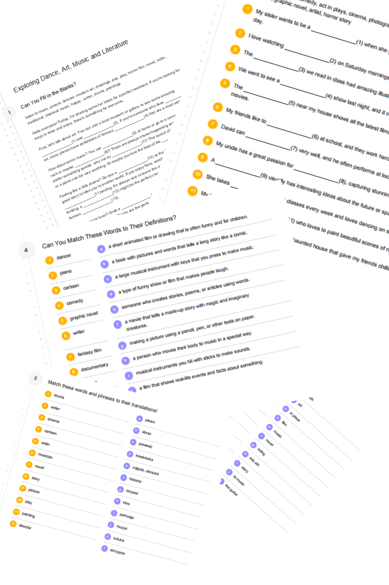 Pięć zadań na słownictwo do działu 1.1 z podręcznika English Class A2+. Całe słownictwo z działu pierwszego w postaci testów możesz znaleźć tutaj. Niniejsze zadania możesz wykorzystać do przeprowadzenia powtórki, kartkówki lub do szybkiego utrwalenia materiału ze słownictwa. Dostajesz 2 wersje: pierwsza - wszystkie zadania "ciągiem" oraz druga - każde zadanie na osobnej stronie.